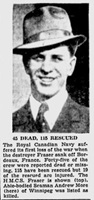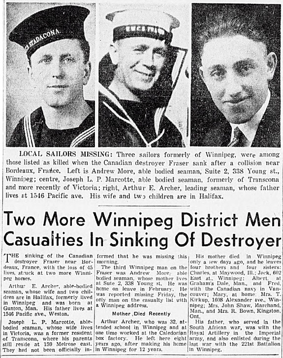 MORE, Andrew, AB, V9314, RCNVR, MPK - 25 Jun 1940, HMCS FRASER - Son of Andrew More, and of Margaret More, of Winnipeg, Manitoba.