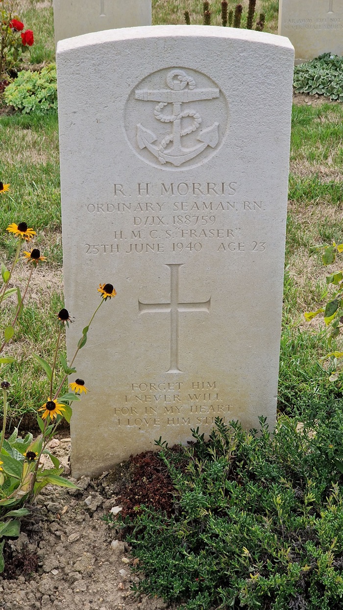 OS Morris died when his ship, HMCS FRASER, was in a collision with HMS CALCUTTA 12 miles due west of Pointe de la Coubre light at the Gironde River mouth and sank as a result with the loss of 65 of her crew. His body was recovered and his is buried in the Pornic War Cemetery, Pornic, France.