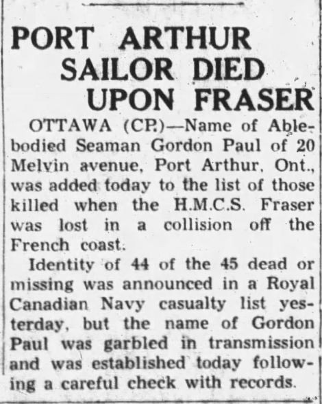 AB Paul died when his ship, HMCS FRASER, was in a collision with HMS CALCUTTA 12 miles due west of Pointe de la Coubre light at the Gironde River mouth and sank as a result with the loss of 65 of her crew. Prior to enlisting he worked as an Elevator Operator for Public Utilities in Port Arthur, ON.