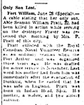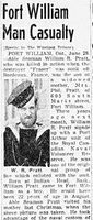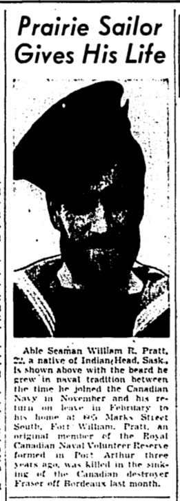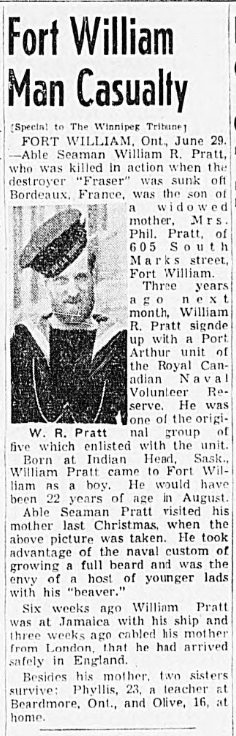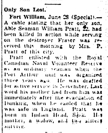 PRATT, William Russell AB, V16013, RCNVR, MPK - 25 Jun 1940, HMCS FRASER - Son of James P. Pratt, and of Effie Edna Pratt, of Fort William, Ontario.