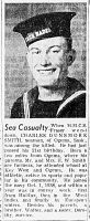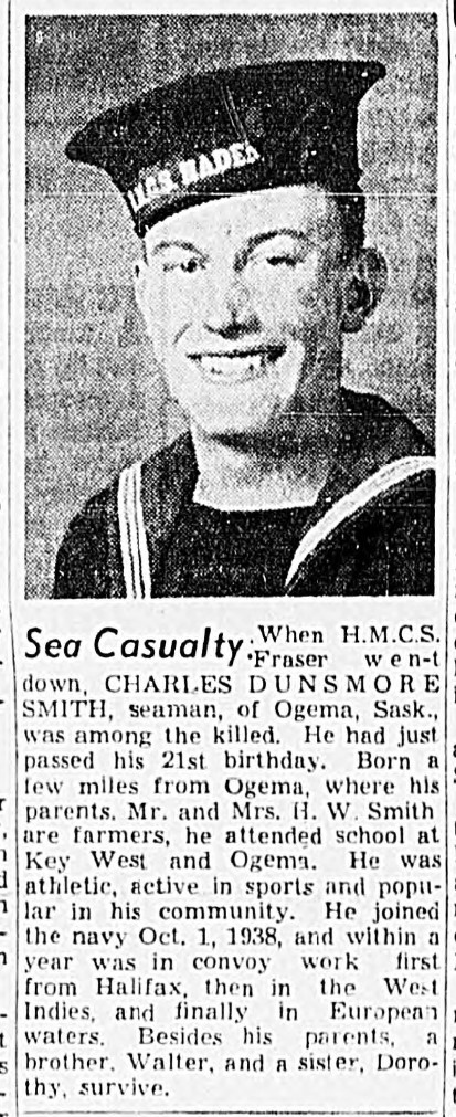 When HMCS Fraser went down, Charles Dunsmore Smith, seaman, of Ogema, Sask., was among the killed. He had just passed his 21st birthday. Born a few miles from Ogema, where his parents, Mr. and Mrs. H.W. Smith are farmers, he attended school at Key West and Ogema. He was athletic, active in sports and popular in his community. He joined the navy Oct. 1, 1938, and with a year was in convoy work first from Halifax, then in the West Indies, and finally in European waters. Besides his parents, a brother, Walter, and a sister, Dorothy, survive. (Transcription of article below)