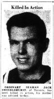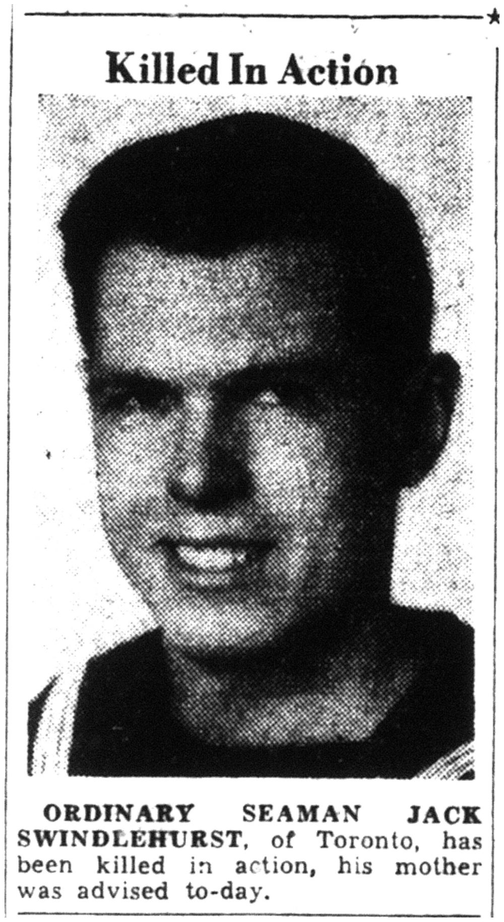 SWINDLEHURST, John Coleman, Ord. Sig, V7559, RCNVR, MPK - 25 Jun 1940, HMCS FRASER - Son of Harry E. and Elizabeth M. Swindlehurst, of Toronto, Ontario.