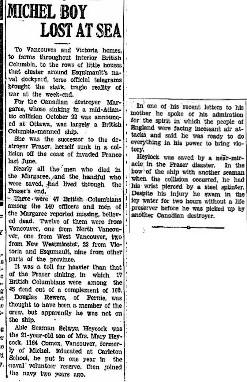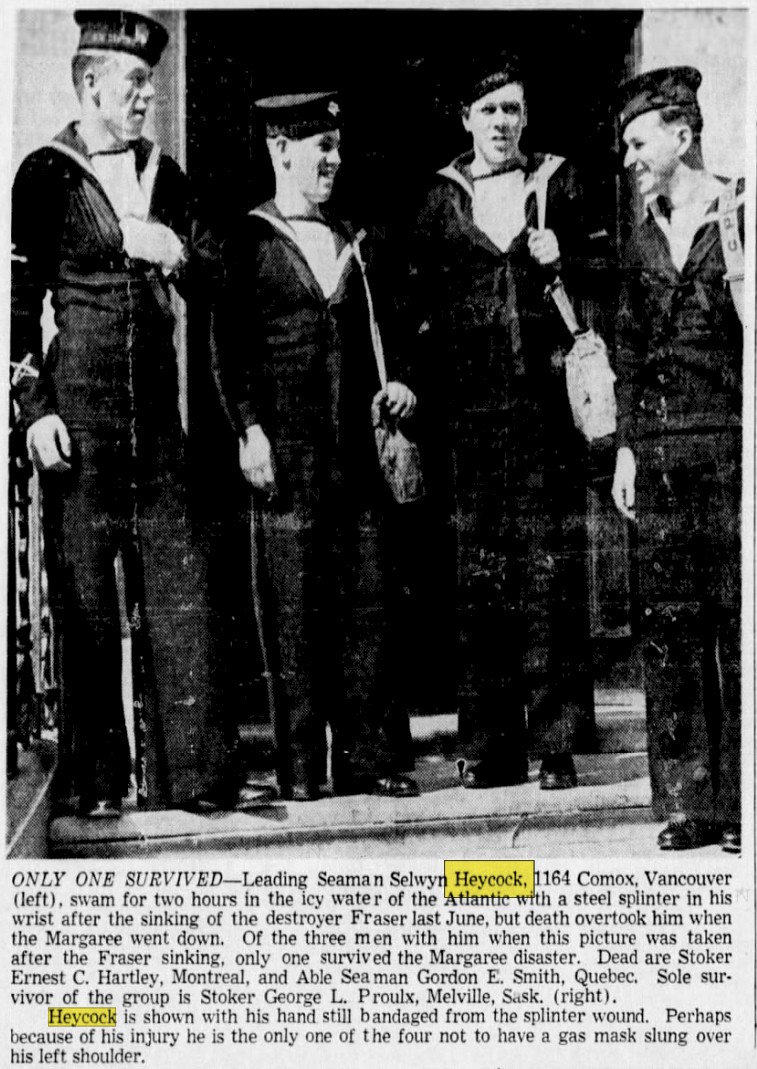 Able Seaman Selwyn Reese Heycock, age 21, resided at 1164 Comox Street is another HMCS Fraser survivor. He was picked up after more than an hour in cold English Channel waters. He lost his life when HMCS Margaree went down after a collision with another ship. Able Seaman Selwyn Heycock was a submarine detection expert. He was a member of the naval reserve in 1937, and was called up for service in October 1938. He served on the destroyer HMCS St. Laurent before transferring to HMCS Fraser. He was a student at Carleton School.