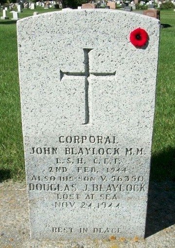 AB Blaylock died when HMCS SHAWINIGAN was sunk by U-1228 on 24 Nov 1944. Of her crew of 91, there were no survivors. Douglas' father, Cpl John Blaylock, L.S.H. C.E.F. died in 1944. Douglas is commemorated on his father's headstone in the Burnsland Cemetery, Calgary, Alberta.