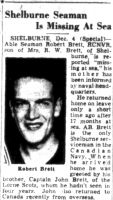 Robert Arthur (Bob) Brett of Shelburne was still a teenager when a torpedo from the German U-boat U- 1228 sank the corvette on November 24, 1944, a mere six months before Nazi Germany surrendered. At the time, the Shawinigan had been escorting the ferry Burgeo on its runs between North Sydney, Nova Scotia and Port aux Basques, Newfoundland. Bob Brett was the youngest son of Shelburne's pioneering car dealer, R. W. Brett, and his wife Mabel.