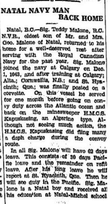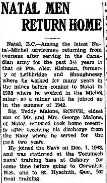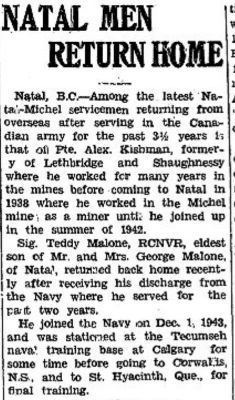 Articles from the Fernie Free Press 12 Jul 1945 and 10 Jan 1946 respectively Courtesy of / Research by Anne Gafiuk