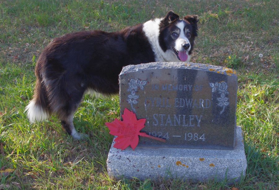 Headstone for Cyril Stanley.  The cast iron maple leaf was placed by his nephew Art, and reads "One who served their country."