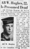 AB Hughes died when HMCS SHAWINIGAN was sunk by U-1228 on 24 Nov 1944. Of her crew of 91, there were no survivors. Prior to joining the Navy he was employed by Fairchild Aircraft Ltd.