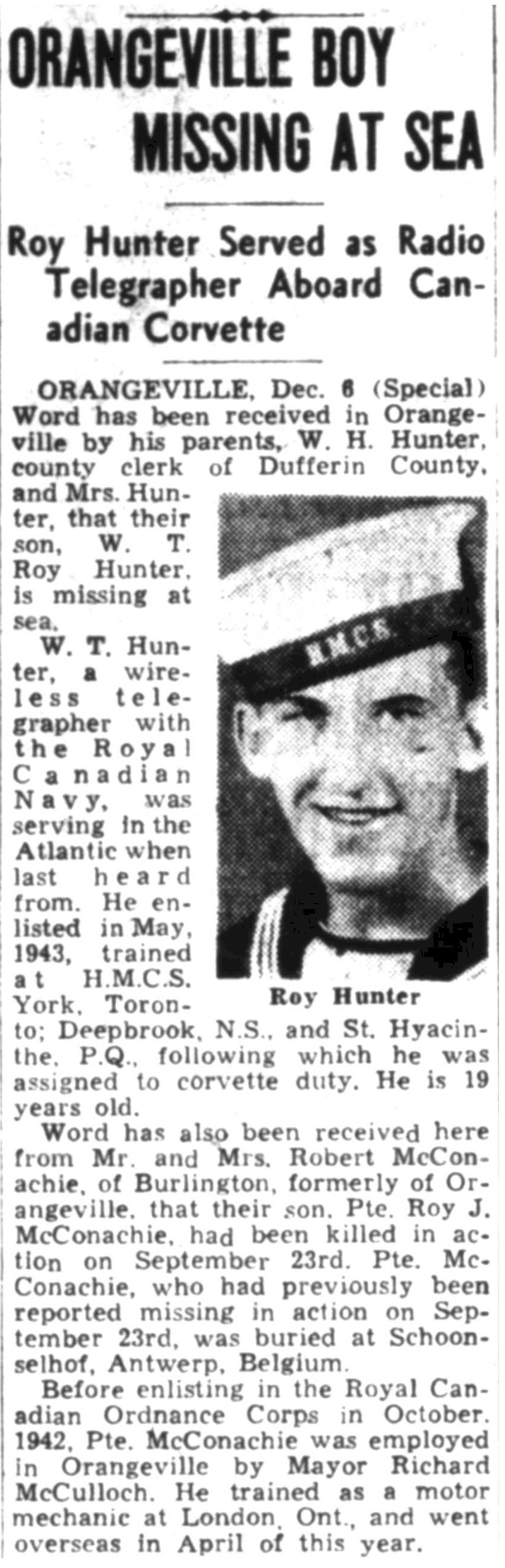 HUNTER, Roy Scott, Ord. Tel., V61071, RCNVR - MPK 25 Nov 1944, HMCS SHAWINIGAN - Roy Hunter was the son of W. H. and Reta Hunter and elder brother of Orangeville Rotarian Keith Hunter. At the time, W. H. Hunter was Dufferin's long-time county clerk, and son Keith says it was during a county council meeting on Nov. 25, 1944, that his father received word of the sinking.