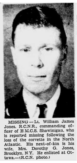 JONES, William James, Lt, RCNR, MPK - 24 Nov 1944, Commanding Officer HMCS SHAWINIGAN - Son of William John and Marion Jones, of Birkenhead, England. Husband of Dorothy G. Jones, of Brooklyn, New York State, US.