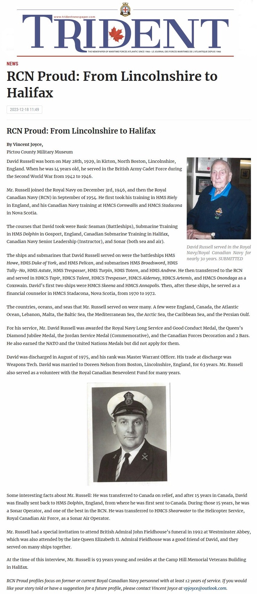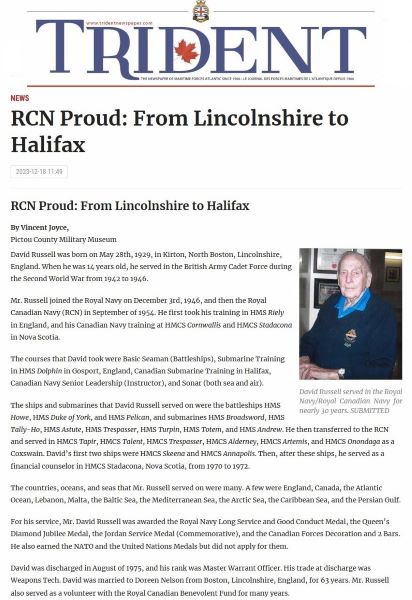 Ships served in: HMS RALEIGH - for Basic Training Dec 1946 HMS HOWE - Jan 1947 for training HMS DUKE OF YORK - Drafted to DUKE OF YORK May 1947 HMS DUCANSBY HEAD (Fleet Repair Vessel) - Drafted to DUNCANSBY HEAD Aug 1947 HMS PELICAN (Wooden Deck Frigate) - Drafted to PELICAN Oct 1947 HMS DOLPHIN - Drafted to DOLPHIN Aug 1949 HMS/m TALLY HO - Served in TALLY HO 1949-Feb 1950 for Submarine Training HMS/m ASTUTE - Drafted to ASTUTE Feb 1950 until Oct 1950 HMS/m TRESPASSER - Drafted to TRESPASSER May 1951 HMS/m TURPIN - Drafted to TURPIN Oct 1952 HMS/m TOTEM - Drafted to TOTEM Feb 1953 HMS/m ANDREW - Drafted to ANDREW Nov 1954 * Transferred to the RCN - Drafted to UK to replace PO2 McLeod who was killed onboard HMS/M Sidon HMS DOLPHIN - Drafted to DOLPHIN Sep 1955 HMS/m TAPIR Drafted to TAPIR Feb 1956 HMS/m TALENT - Drafted to TALEN Jun 1957 HMS/m TRESPASSER - Drafted to TRESPASSER Aug 1957 HMS/m ALDERNEY - Drafted to ALDERNEY (part of 6th Submarine Sqn) as Cox'n Oct 1957 until Mar 1960 HMS/m ARTEMIS - Drafted to ARTEMIS (part of 6th Submarine Sqn) Aug 1961 HMCS ONONDAGA - Drafted to ONONDAGA May 1965 (while under construction). Commissioning crew as CPO1, Cox'n. Served in ONONDAGA until Apr 1969 HMCS SKEENA- Drafted to SKEENA Feb 1971 until Oct 1972 HMCS ANNAPOLIS - Drafted to ANNAPOLIS Oct 1972 until Mar 1974 STADACONA (CFB HALIFAX) - Served in STADACONA as a financial counsellor 1970-1972 * Honourably Released - 1975