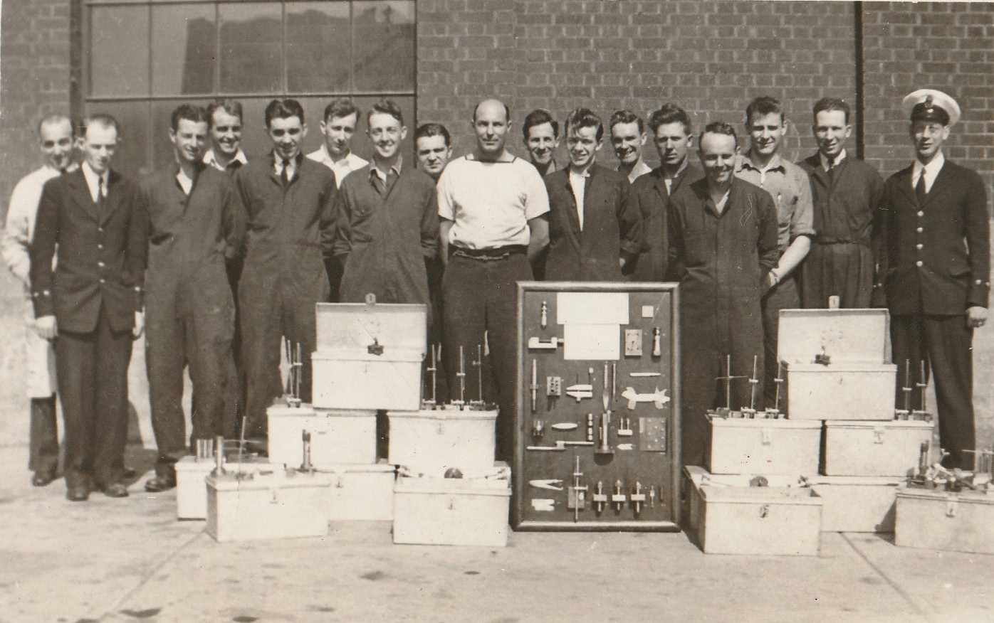 Unknown Course photo - possibly an Electrical Artificer's course photo Front Row: (1) F. Gravely - Montreal (2) F. Lummus - Toronto (3) H. Sweezey - Toronto (4) I. Causton - Windsor (5) D. Ebsworth - Calgary (6) Tozer - Oshawa (7) R. Jack - Edmonton (8) A. Bannerman - Strathmore, QC (9) O. Clingersmith, Chatham (10) N. Petroff - Welland (11) H. Warren - Toronto (12) H. Bell - London. Middle Row: (13) W. Truman - Vancouver (14) C. Allen - Toronto (15) Jepson - Hamilton (16) W. Byron - Montreal (17) H. Kemp - Kirkland Lake (18) S. Pridham - Sudbury (19) W. Henderson - London (20) C. Roach - Sydney (21) C. Marion - Vancouver (22) G. Didley - Sudbury (23) J. Clark - Port Arthur Back Row: (24) T. Fields - Meritown (25) L. Smart - Crowland (26) L. Higgins - Grand Pre (27) R. Fawcett - Hamilton (28) J. Lamond - Calgary (29) F. Stickley - Toronto (30) R. Dickhout - Dunnville (31) W. McCrae - Halifax (32) A. Bourque - Shediac, NB (33) V. Noirel - Windsor (34) G. Burgess - Toronto Absent When Taken: J. McInnis - Dartmouth and W. VanWinkle - Toronto