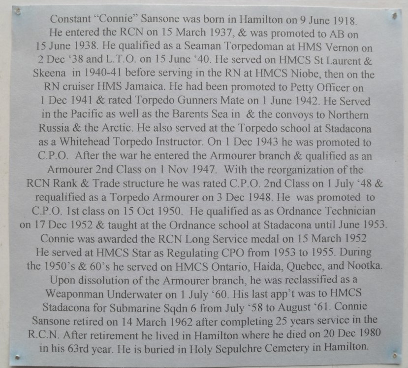 Ships served in: HMCS STADACONA - Enlisted 15 Mar 1937 as an Ordinary Seaman, RCN HMCS ST LAURENT - Drafted to ST LAURENT 31 Jul 1937 HMCS SKEENA - Drafted to SKEENA 21 Apr 1938 * Rated Able Seaman, RCN 15 Jun 1938 * Rated Seaman Torpedoman, RCN 02 Dec 1938 HMCS STADACONA - Drafted to STADACONA 01 Apr 1940 * Rated Acting Leading Seaman, RCN 15 Jun 1940 * Rated Leading Torpedoman, RCN 15 Jun 1940 S.S. PASTEUR - Drafted to the troopship PASTEUR 10 Aug 1940 HMCS STADACONA - Drafted to STADACONA 23 Aug 1940 HMCS SKEENA - Drafted to SKEENA 02 Jun 1941 * Rated Leading Seaman, RCN 15 Jun 1941 * Rated Acting Petty Officer, RCN 01 Dec 1941 HMCS STADACONA - Drafted to STADACONA 02 Jan 1942 * Rated Torpedo Gunner's Mate, RCN 30 May 1942 * Rated Petty Officer, RCN 01 Dec 1942 HMCS CORNWALLIS - Drafted to CORNWALLIS 04 Feb 1943 HMCS STADACONA - Drafted to STADACONA 06 Feb 1943 HMS GEORGETOWN - Drafted to GEORGETOWN 06 Feb 1943 HMCS CORNWALLIS - Drafted to CORNWALLIS 02 Mar 1943 HMCS STADACONA - Drafted to STADACONA 01 Jun 1943 HMCS NIOBE - Drafted to NIOBE 01 Nov 1943 HMS MARLBOROUGH - Drafted to MARLBOROUGH 03 Dec 1943 HMCS NIOBE - Drafted to NIOBE 20 Jan 1944 HMS JAMAICA - Drafted to JAMAICA 09 Feb 1944 * Rated Chief Petty Officer, RCN 01 Dec 1943 (backdated) HMCS NIOBE - Drafted to NIOBE 08 Oct 1944 HMCS PEREGRINE - Drafted to PEREGRINE 23 Oct 1944 HMCS STADACONA - Drafted to STADACONA 22 Nov 1944 HMCS PEREGRINE - Drafted to PEREGRINE 20 Jan 1945 HMCS NIOBE - Drafted to NIOBE 26 Feb 1945 HMCS ONTARIO - Drafted to ONTARIO 16 Apr 1945 HMCS STADACONA - Drafted to STADACONA 04 Mar 1946 * Revered to Petty Officer RCN 01 Oct 1946 * Transferred. Rated Acting Electrical Technician 2nd Class, RCN 01 Jul 1947 * Transferred. Rated Acting Armourer 2nd Class, RCN 01 Nov 1945 * Rated Armourer 2nd Class 03 Dec 1948 HMCS HAIDA - Drafted to HAIDA 06 Dec 1948 * Rated Petty Officer 1st Class Torpedo Armourer TG3, RCN 01 Jul 1948 * Rated Chief Petty Officer 2nd Class Torpedo Armourer TG3, RCN 01 Jul 1948 (advanced) * Rated Chief Petty Officer 1st Class Torpedo Armourer TG4, RCN 02 Dec 1948 HMCS STADACONA - Drafted to STADACONA 03 Feb 1950 HMCS NADEN - Drafted to NADEN 05 Nov 1951 HMCS QUEBEC - Drafted to QUEBEC 14 Jan 1952 HMCS NADEN - Drafted to NADEN 15 Oct 1952 HMCS STADACONA - Drafted to STADACONA 17 Dec 1952 HMCS STAR - Drafted to STAR 30 Jun 1953 HMCS STADACONA - Drafted to STADACONA 04 Jul 1955 HMCS NOOTKA - Drafted to NOOTKA 01 Aug 1955 HMCS STADACONA (SM6) - Drafted to (STADACONA for) 6TH SUBMARINE SQUADRON 28 Jul 1958 * Rated Chief Petty Officer 1st Class Weaponman Underwater, RCN 01 Jan 1960 (Assigned new trade) HMCS STADACONA - Drafted to STADACONA (Release Centre) 09 Aug 1961 * Honourably Released 14 Mar 1962