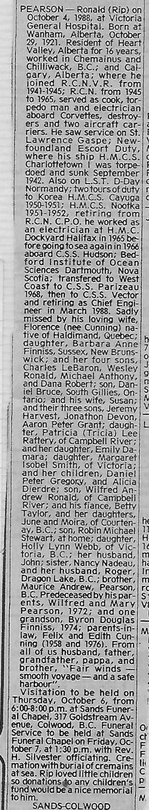 HMCS CHARLOTTETOWN - Survived the sinking of CHARLOTTETOWN * Served in an unknown landing craft on D-Day HMCS CAYUGA - Served in CAYUGA for her 1950-1951 Korean War Tour HMCS NOOTKA - Served in NOOTKA for her 1951-19523 Korean War Tour