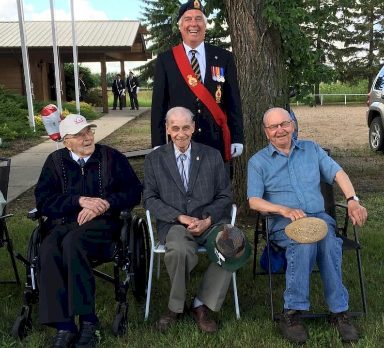 L-R: Second World War Veterans Grant Cheram, RCNVR; Bert Braiden, RCNVR; and Nelson Bergum, RCAF watching a Canada Day parade c2017 Courtesy of Perry Robinson