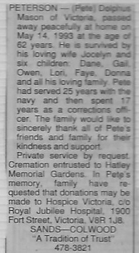 PETERSON, Dolphus Mason (Pete) of Victoria, passed away peacefully at home on May 14, 1993 at the age of 62 years. He is survived by his loving wife Jocelyn and six children: Dane, Gail, Owen, Lori, Faye, Donna and all his loving family. Pete had served 25 years with the navy and then spent 17 years as a corrections officer. The family would like to sincerely thank all of Pete's friends and family for their kindness and support. Private service by request. Cremation entrusted to Hatley Memorial Gardens. In Pete's memory, family have requested that donations may be made to Hospice Victoria, C/o royal Jubilee Hospital, 1900 Fort Street, Victoria, V8R 1J8.