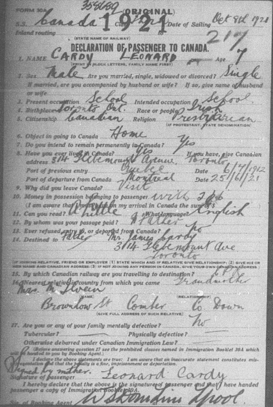 Below - passenger declaration for Leonard Cardy returning to Canada from a visit to his grandmother in Comber, County Down, Northern Ireland.