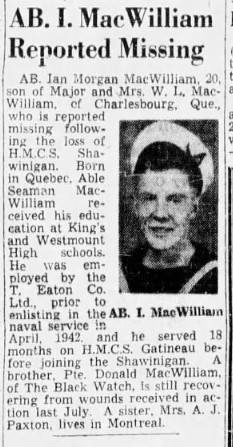 MACWILLIAM, Jack Ian, AB Radar III, V46437, RCNVR, MPK - 24 Nov 1944, HMCS SHAWINIGAN - Son of Leo and Mary Johanna MacWilliam, of Charlesbourg, Quebec.