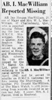 (JM01) Article from the Montreal Star on Jack MacWilliam reported missing (JM02) Documents from the Service File of Jack MacWilliam