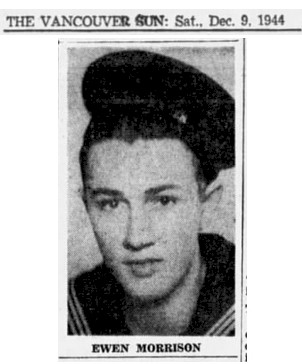 MORRISON, Ewen, LS QR III, V30386, RCNVR, MPK - 24 Nov 1944, HMCS SHAWINIGAN - Son of Malcolm and Kate Morrison, of Vancouver, British Columbia.