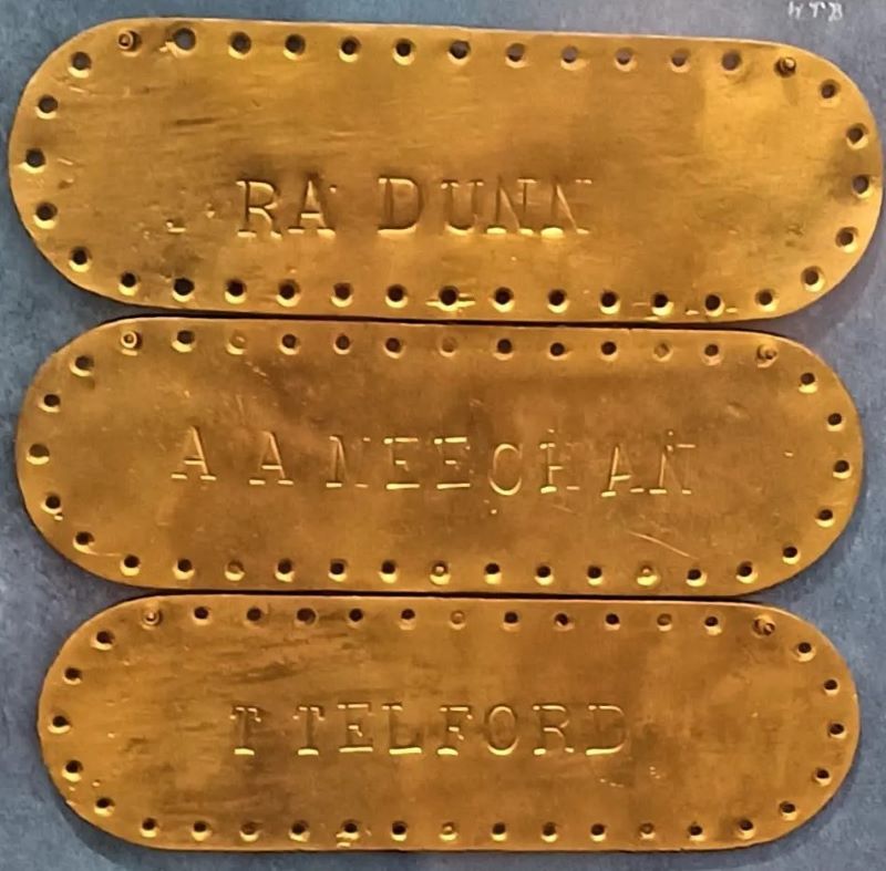 On December 6, 1917, when SS Imo and Mont- Blanc collided in the Halifax harbour and exploded, HMCS NIOBE was in the path of the explosion and the upper deck caught on fire. In order to save the ship, the crew was ordered to throw everything on fire overboard! These brass name plates are from the bottoms of sailor's duffle / ditty bags and were discovered several years ago during construction work around the Halifax Dockyard. Source: Naval Museum of Halifax - 2024