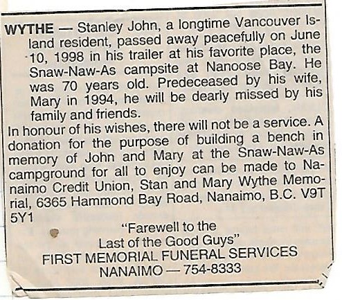 Died: 11 Jun 1998, Snaw-Naw-As Campground, Nanoose Bay, British Columbia