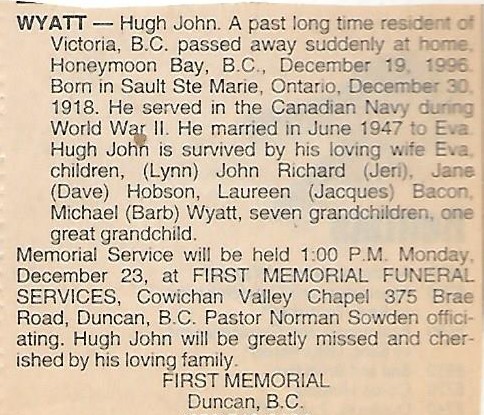 Died: 19 Dec 1996, Honeymoon Bay, British Columbia