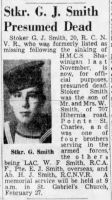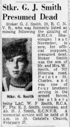 Stoker Smith died when HMCS SHAWINIGAN was sunk by U-1228 on 24 Nov 1944. Of her crew of 91, there were no survivors. He was one of four brothers serving in the armed forces, the others being LAC W. F. Smith R.C.A.F. overseas and AB H. J. Smith, R.C.N.V.R.