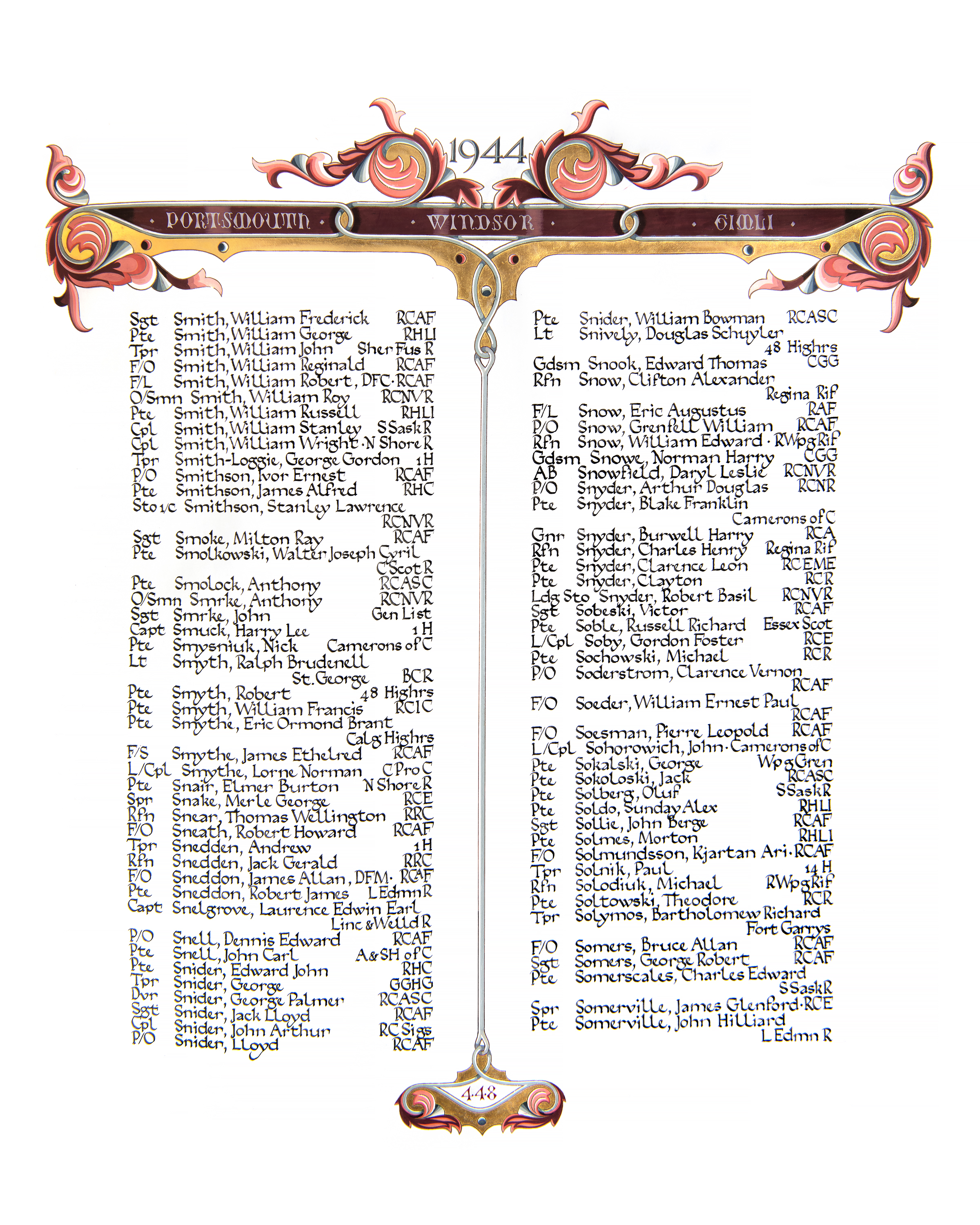 Ships served in: HMCS PREVOST - Enlisted 21 Aug 1942. Commenced Active Service 21 Sep 1942 as a Stoker 1st Class, RCNVR HMCS NADEN - Drafted to NADEN 26 Sep 1942 RCN COLLEGE - Drafted to RCN COLLEGE 28 Oct 1942 HMCS NADEN - Drafted to NADEN 18 Nov 1942 RCN COLLEGE - Drafted to RCN COLLEGE 18 Jan 1943 HMCS GIVENCHY - Drafted to GIVENCHY 14 Jun 1943 HMCS CANSO - Drafted to CANSO 14 Jun 1943 HMCS GIVENCHY - Drafted to GIVENCHY 30 Jun 1943 HMCS TECUMSEH - Drafted to TECUMSEH 07 Jul 1943 for course at No. 21 Training Centre, Exhibits Bldg, Victoria Park, Calgary, Alta. HMCS CORNWALLIS - Drafted to CORNWALLIS 22 Jan 1944 HMCS STADACONA - Drafted to STADACONA 13 May 1944 HMCS SHAWINIGAN - Drafted to SHAWINIGAN 01 Jul 1944