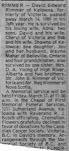 Died: 14 Mar 1989, Kelowna, British Columbia age 76