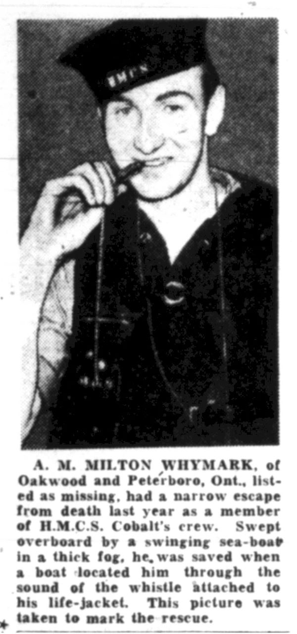 Able Seaman Milton E. Whymark of Oakwood is the first sailor from the village and district to be reported as "missing at Sea". Word to this effect was received from the young seaman's wife now residing at Halifax and was forwarded to his parents, Mr. and Mrs. Whymark residents of Oakwood. Seaman Whymark was born in Oakwood and received his early education in the Public School. He was well-Known and quite a lad. He enlisted in 1941. His father is a veteran of the last Great War with four years' service in the infantry to his credit.