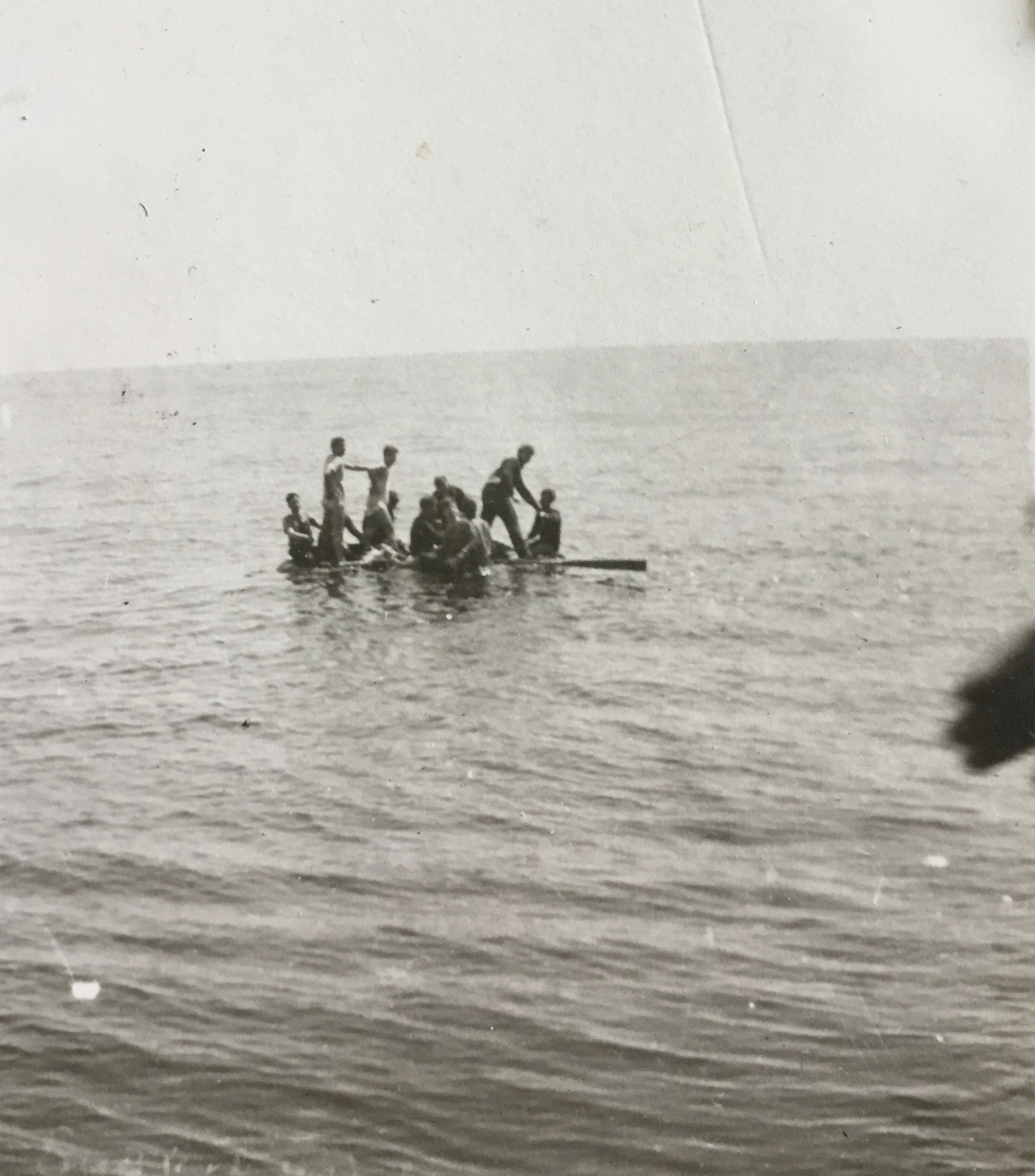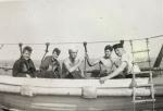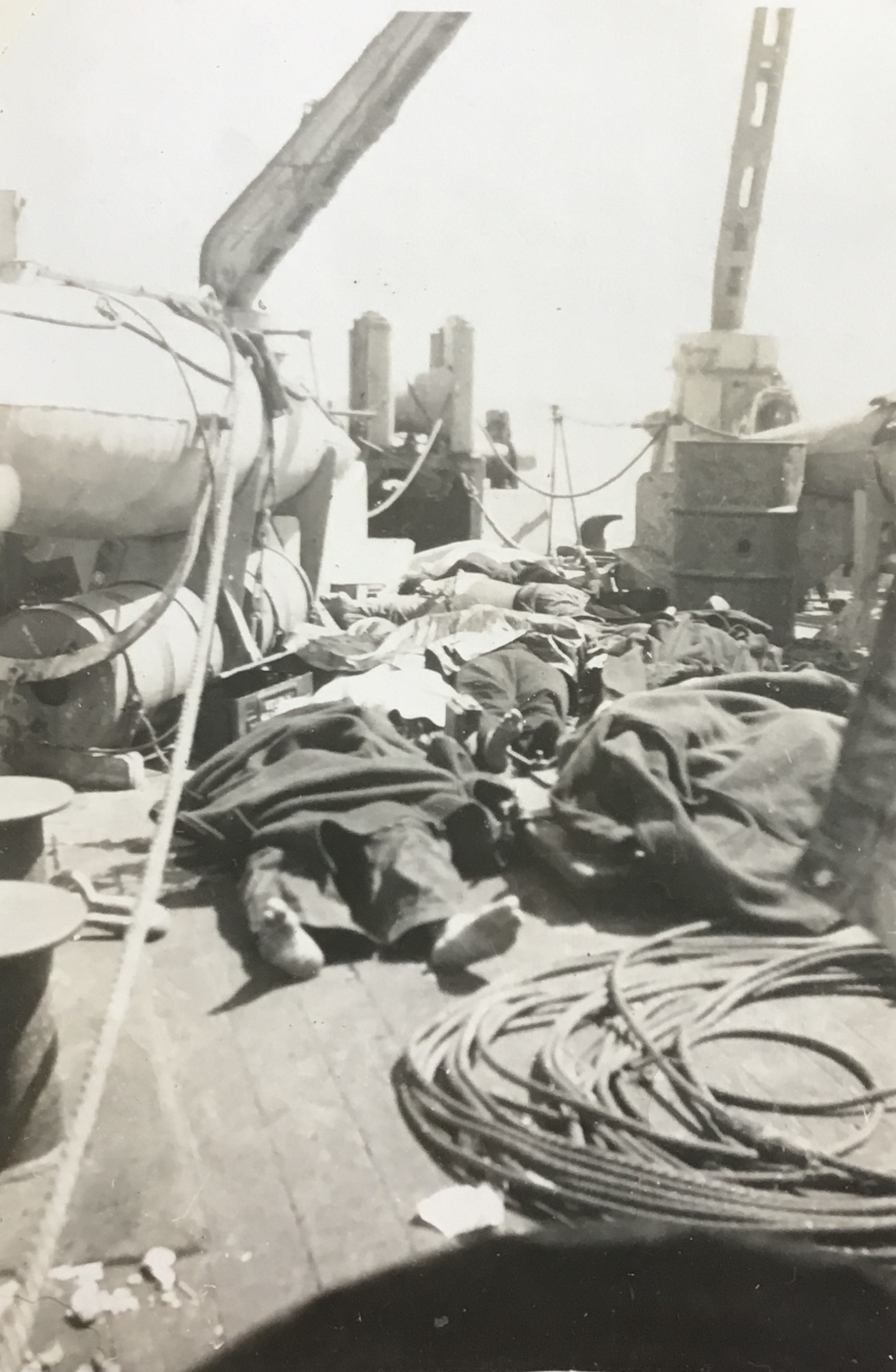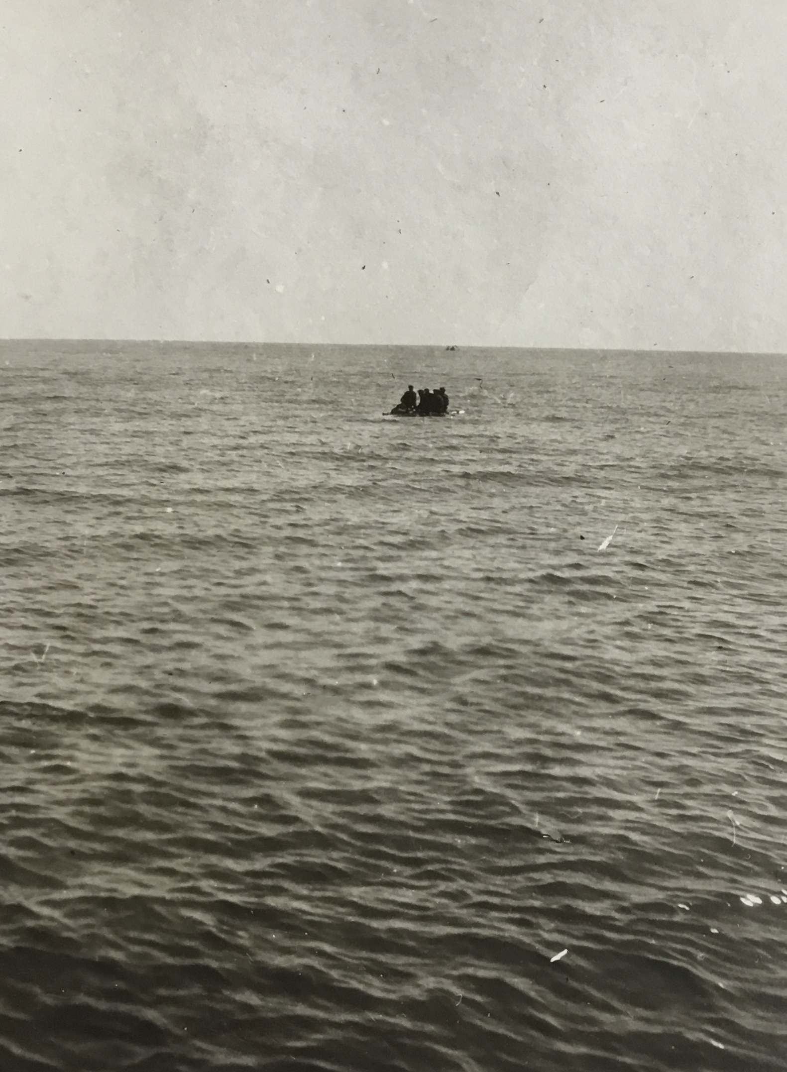 (HF63) ESQUIMALT'S dead on the quarterdeck of HMCS SARNIA J309 (HF64) HMCS ESQUIMALT'S survivors on a raft (HF65) HMCS ESQUIMALT'S survivors on a raft. On the back of the photo - "I am sitting in the middle, Joe Wilson on the stern, only six of us were alive when the Sarnia came alongside and Joe and I told the Sarnia to get the others first." (HF66) survivors from ESQUIMALT being picked up by the ship's boat from East Halifax Lightship (HF67) Heading back into Halifax