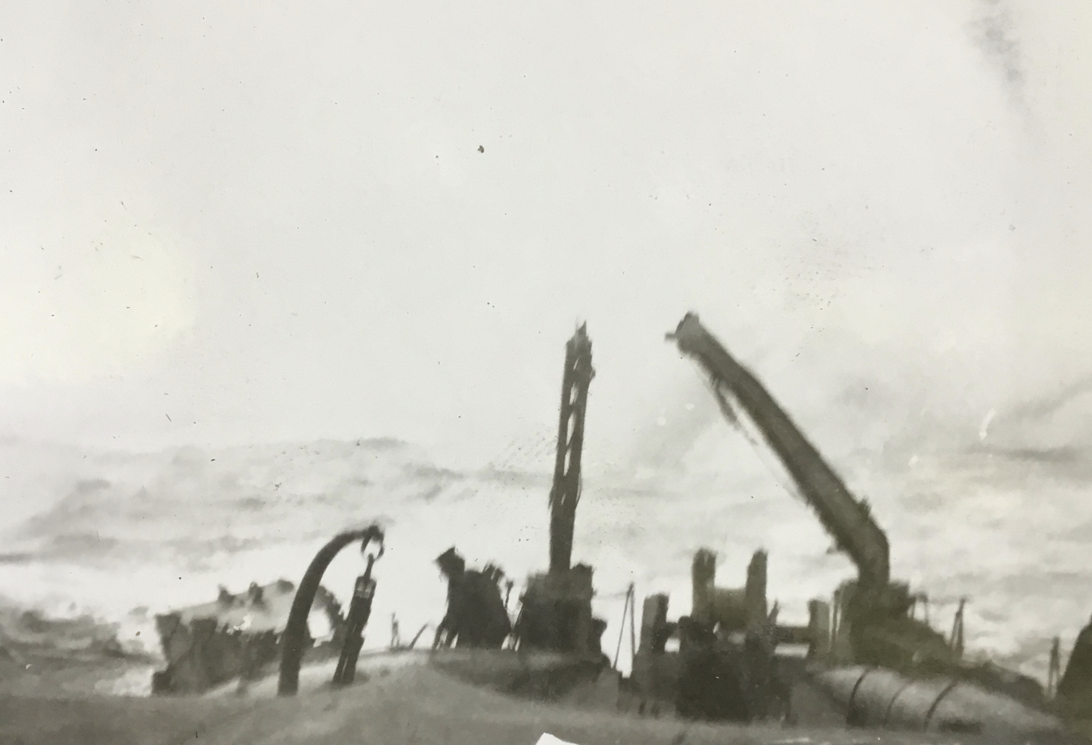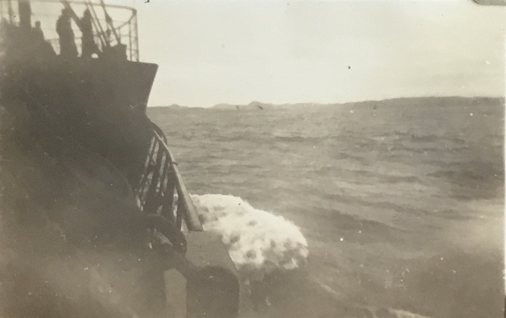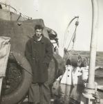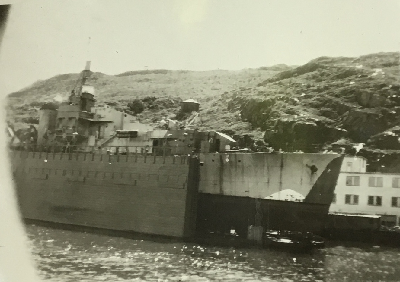 (HF08) U.S. Cutter (HF09) "Burgeo on our trip over" (HF10) Coast of Newfoundland dead ahead (HF11) "Frenchy" (HF12) Minesweeping paravane on the quarterdeck of HMCS SARNIA J309
