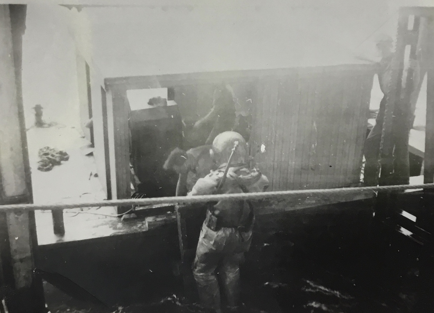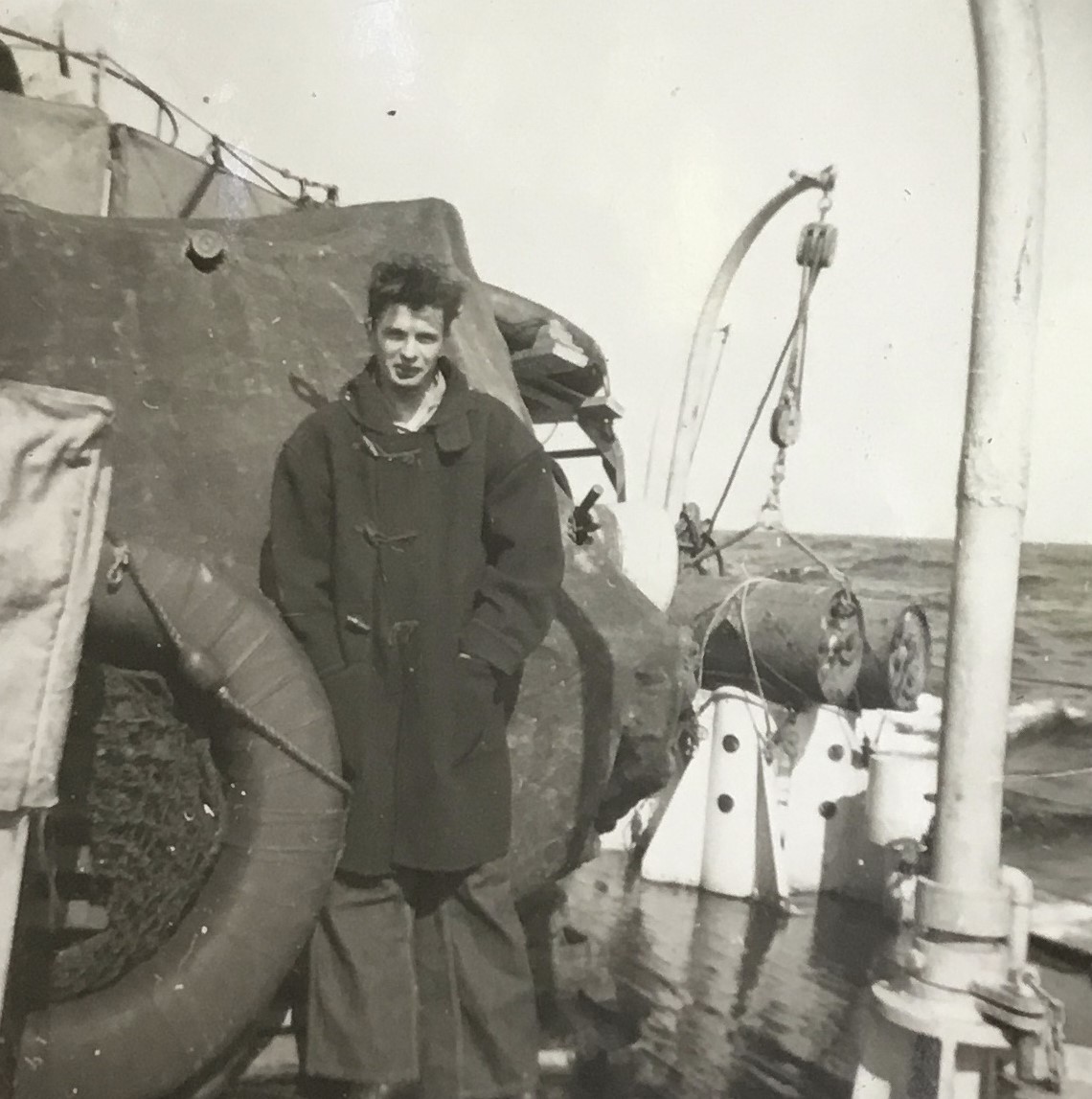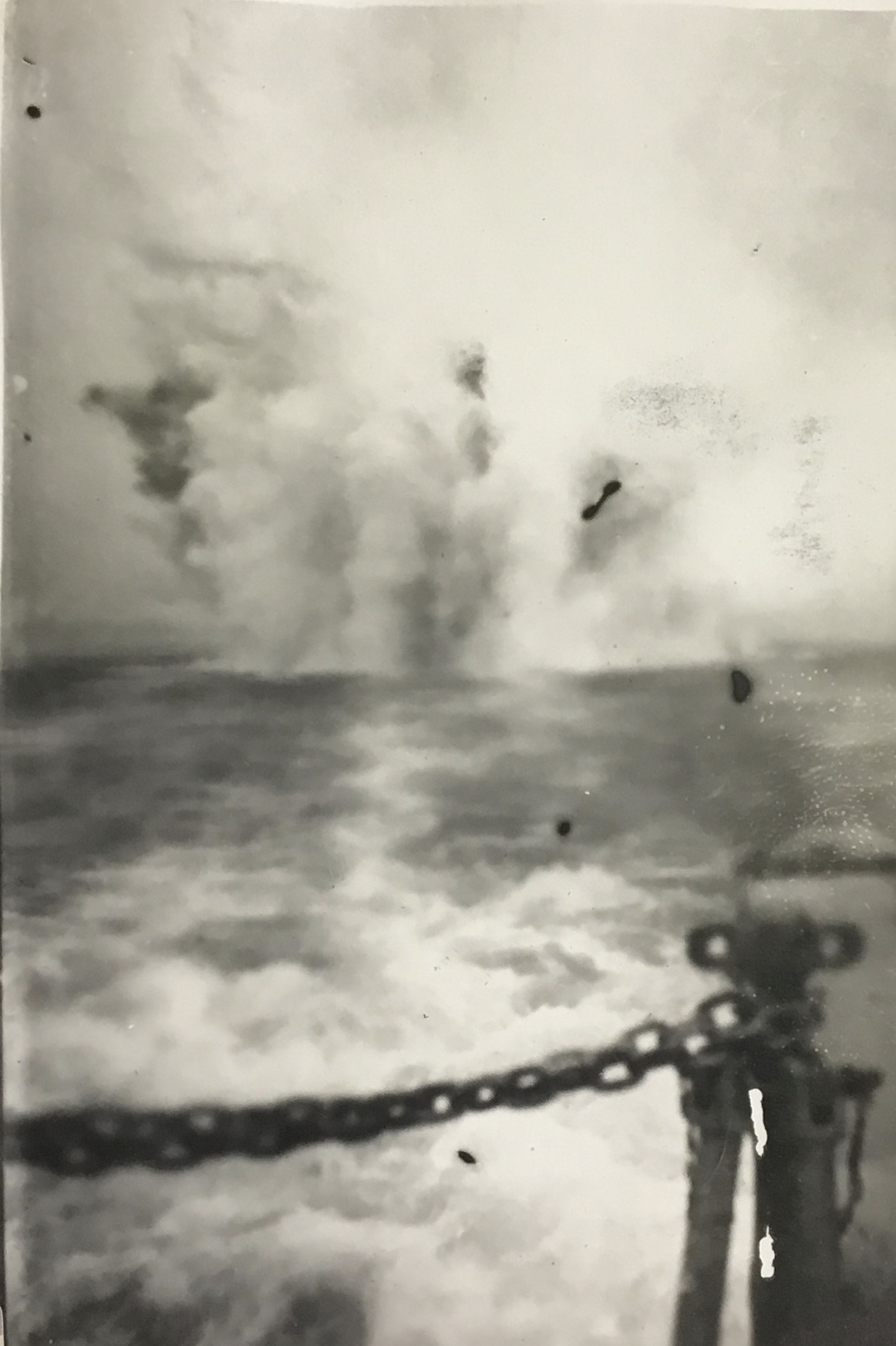 (HF53) Howard Finkbeiner on his 21st birthday - 1945 (HF54-HF55) Diving Tender working alongside HMCS SARNIA J309 with the diver climbing back on to the Diving Tender (HF56-HF57) Depth charge exploding astern of HMCS SARNIA J309