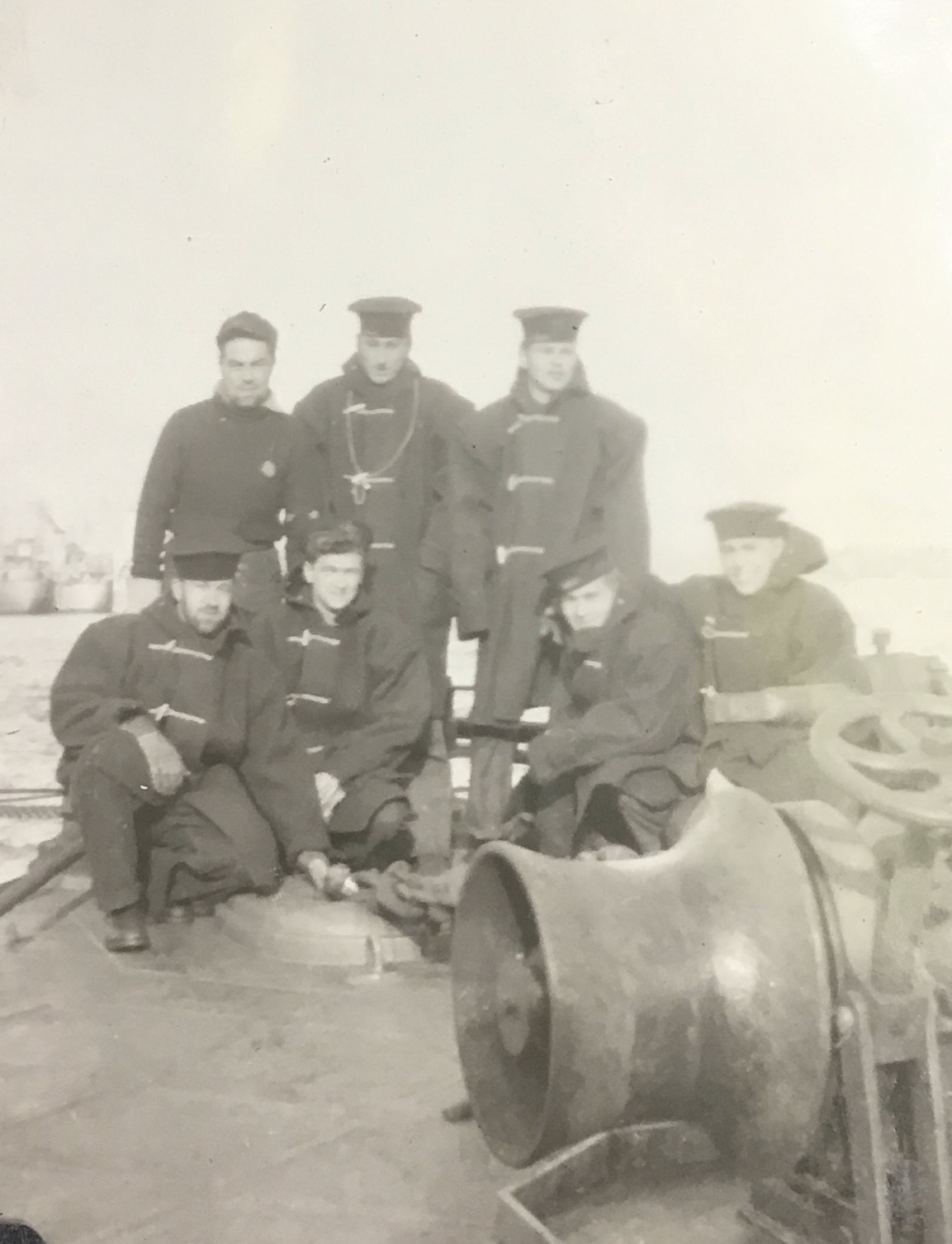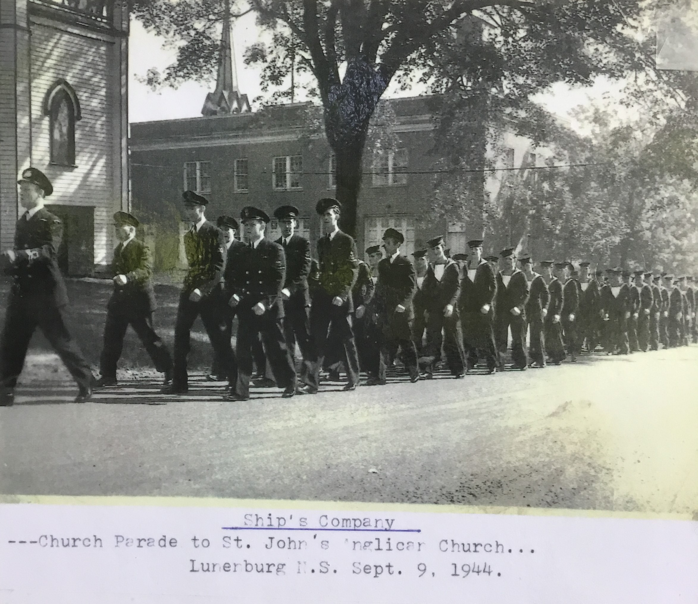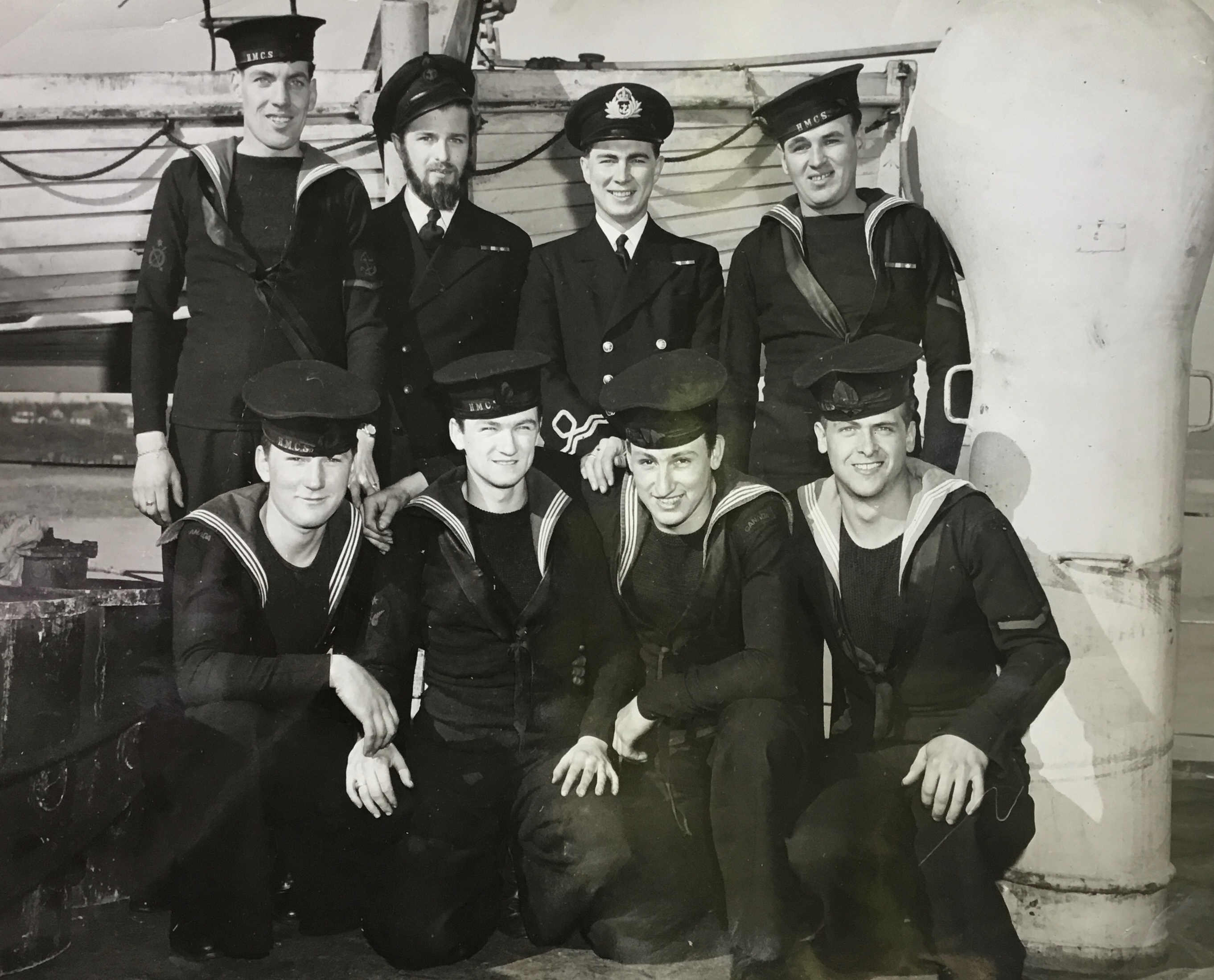 (HF58) HMCS SARNIA J309 (HF59) Merchant ship with its stern missing at anchor Halifax Harbour (HF60) An officer and 7 ratings on HMCS SARNIA J309. All unknown except for SBA Finkbeiner, rear, 2nd from left (HF61) - Lou Howard, Bill Cowie, Katzberg (HF62) Ship's Company HMCS SARNIA J309 - Church Parade to St. John's Anglican Church, Lunenburg, NS 09 Sep 1944