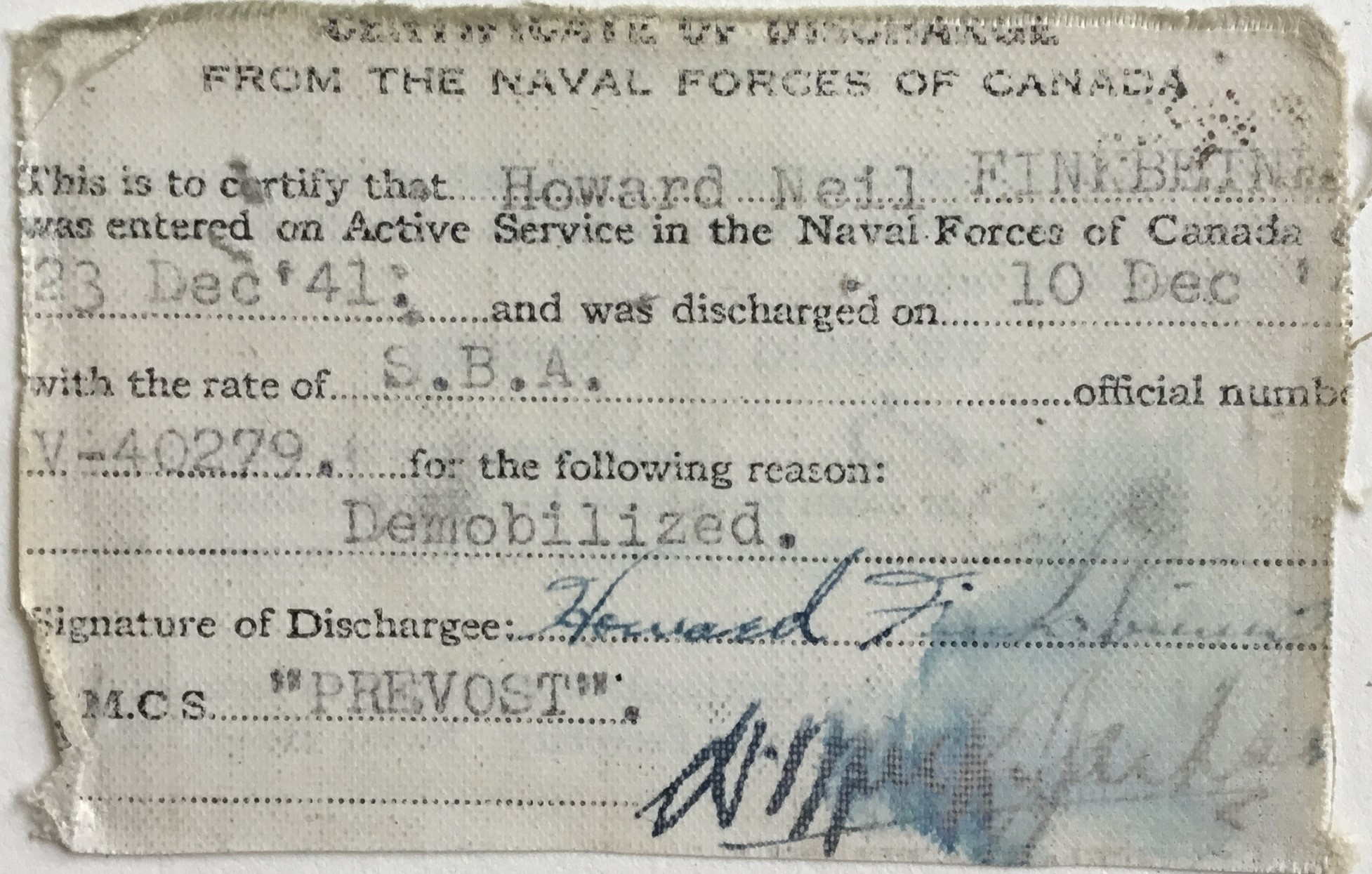 (HF00) Portrait of SBA Howard Finkbeiner (HB01) Howard's Certificate of Discharge from the RCNVR