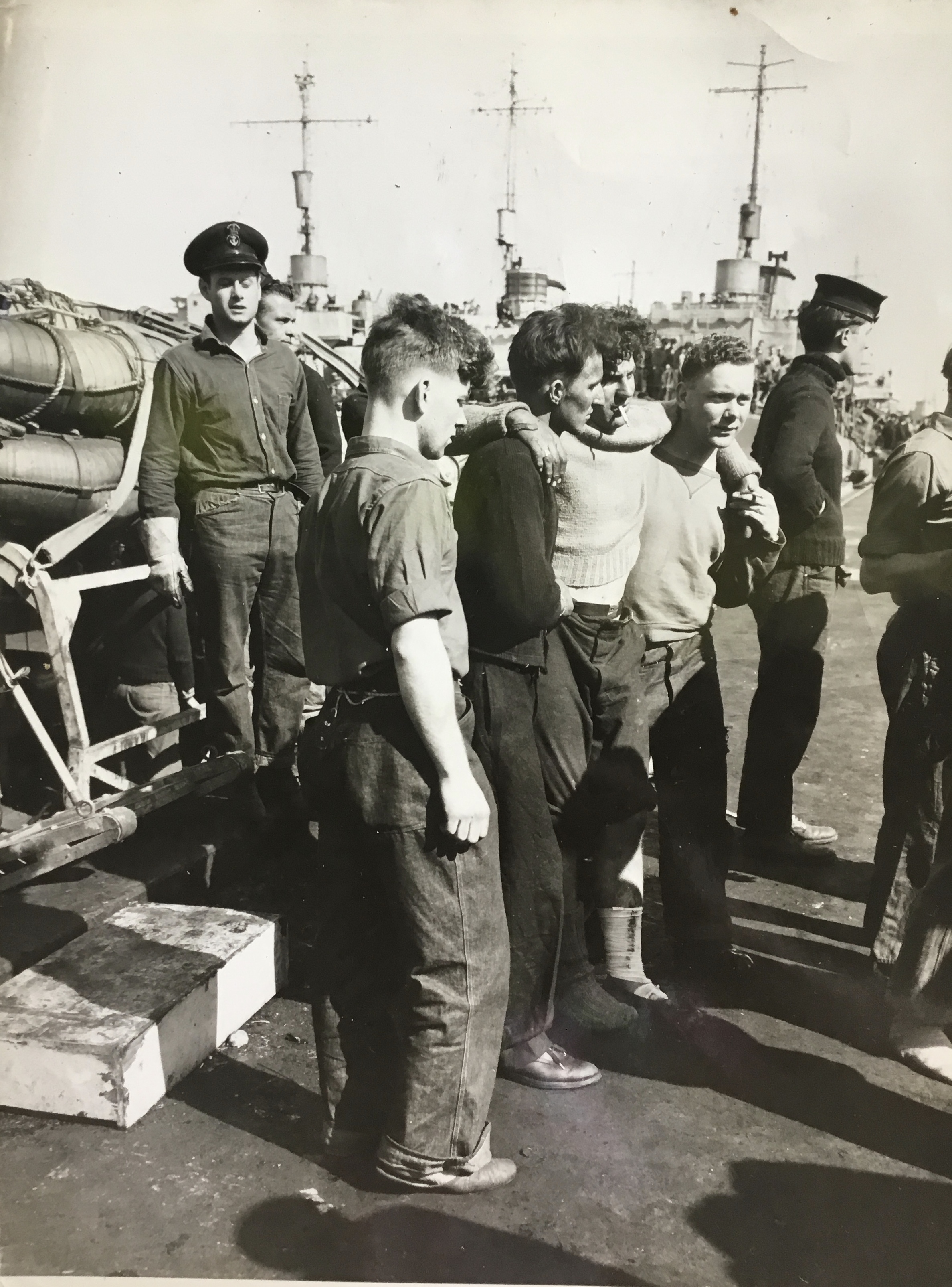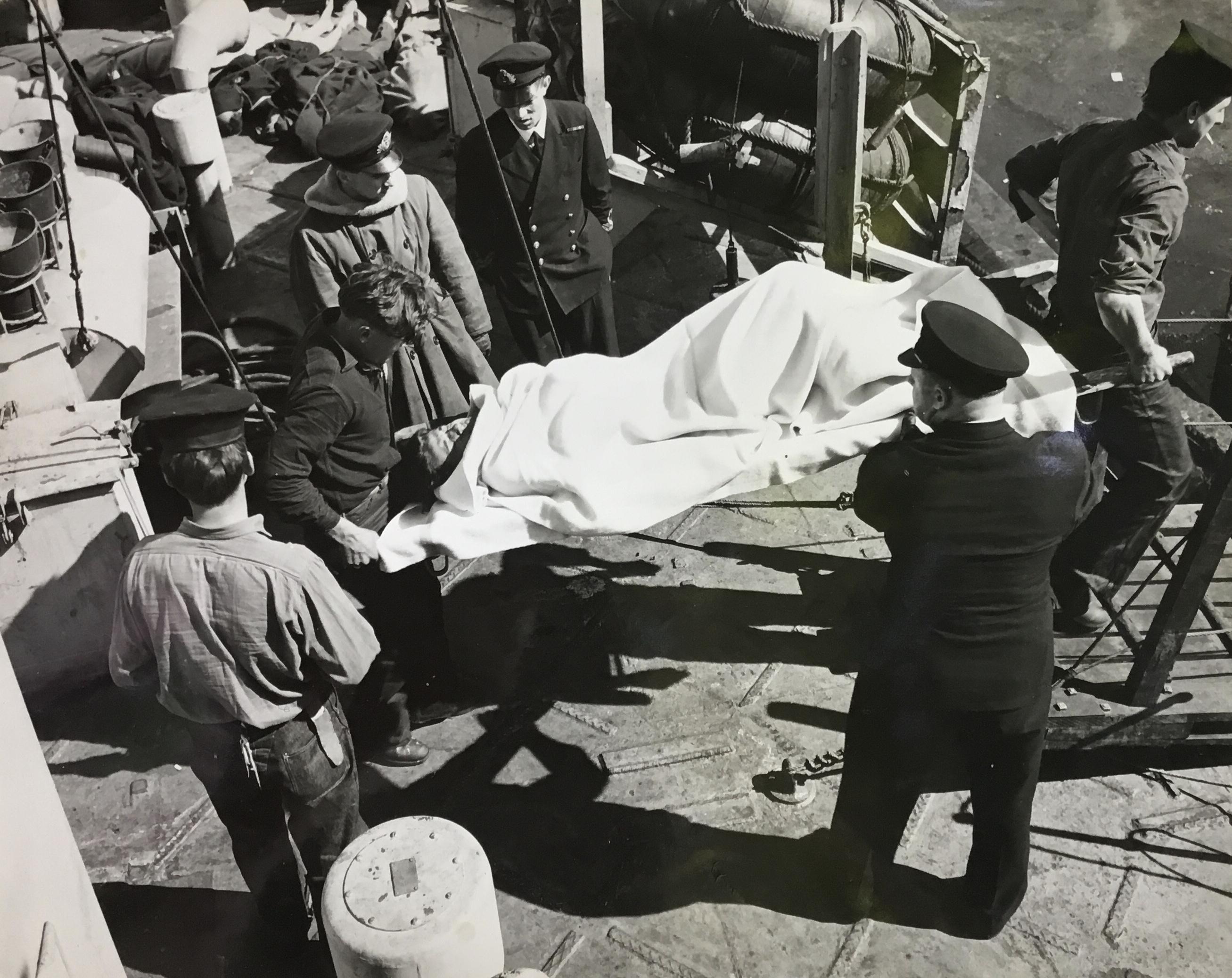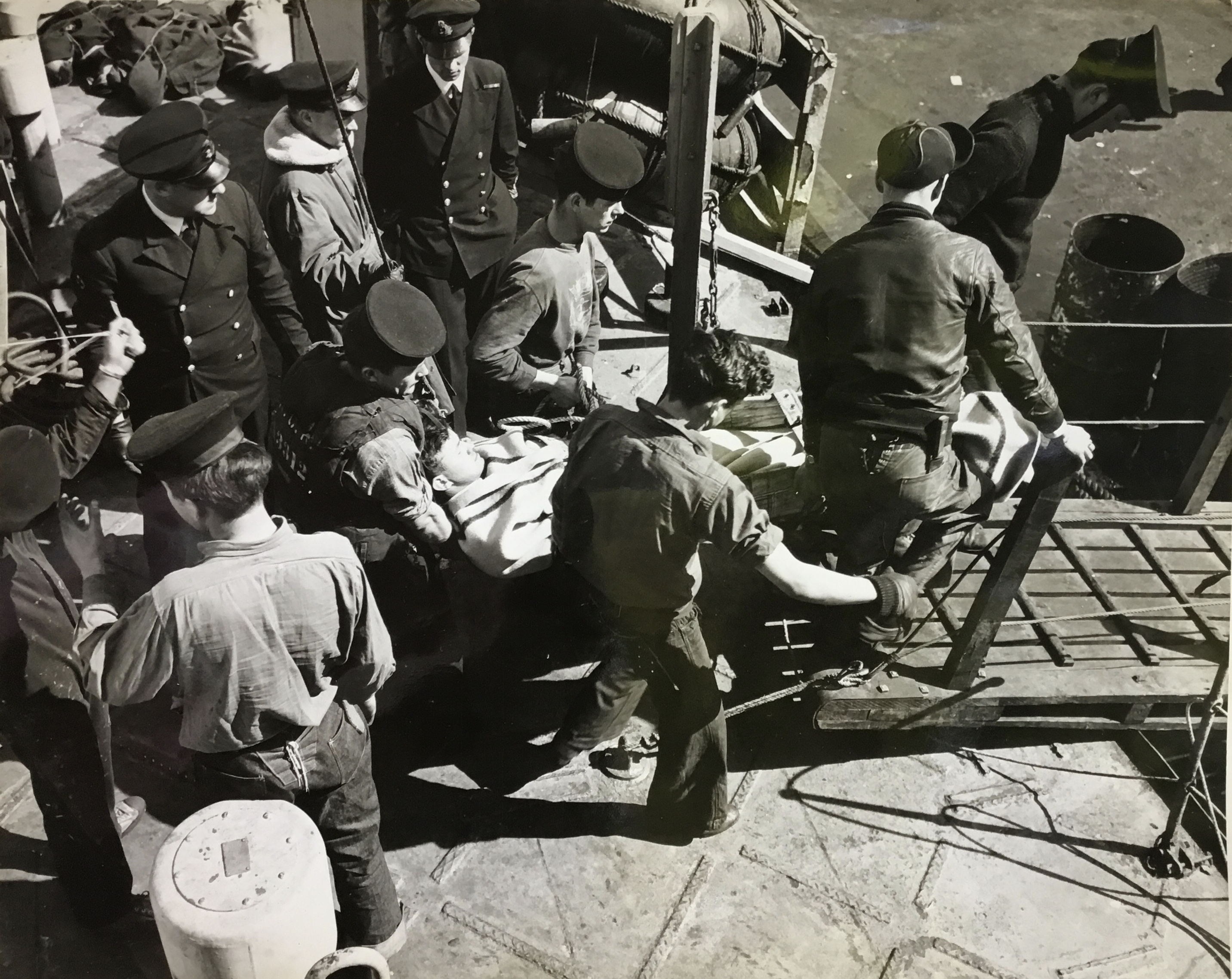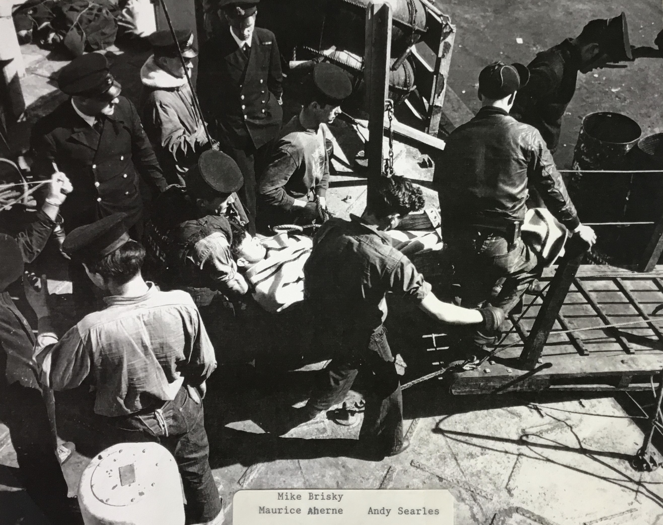 HMCS ESQUIMALT'S survivors being assisted or carried off HMCS SARNIA J309 (HF68) An ESQUIMALT survivor being carried off HMCS SARNIA in a stretcher. SBA Howard Finkbeiner left hand side of photo. (HF72) This is the same photo as HF71, but has 3 names - Mike Brisky, Maurice Ahern and Andy Searles - listed on the bottom of the photo. It is not known which 3 sailors they are.