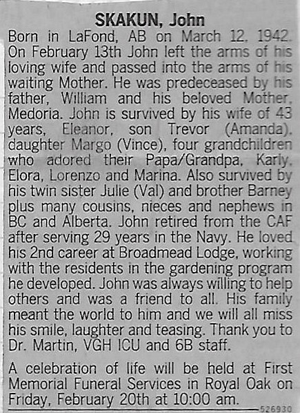 Born: 12 Mar 1942, Lafond, Alberta