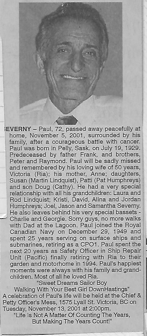SEVERNY, Paul - Passed away in Victoria, BC at the age of 72. He was born in Pelly, Saskatchewan, the son of Frank & Anne Severny. He served 25 years in the Royal Canadian Navy and retired as a CPO1 Chief Engineer. He served part of his military career in Submarines. He was Commissioning crew in HMCS Grilse in 1961 and also served in HMCS Onondaga as CERA.