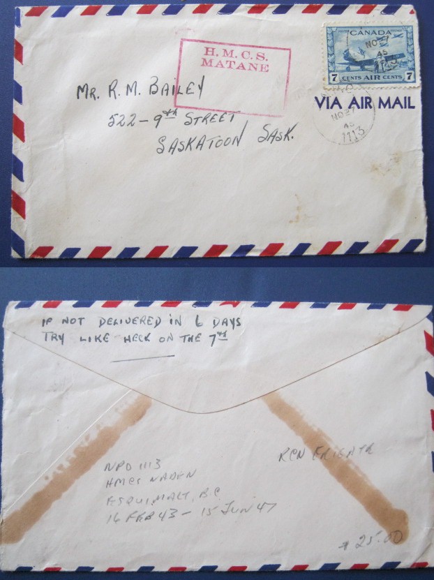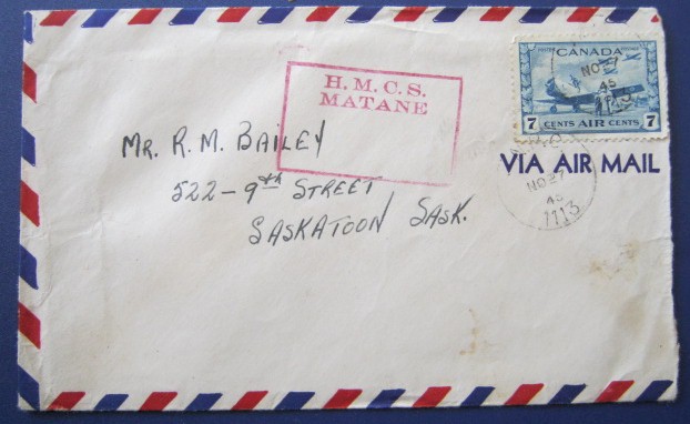 Envelope from letter addressed to R. M. Bailey of Saskatoon, SK Stamp Cancellation 27 Nov 1945 Courtesy of David Upright