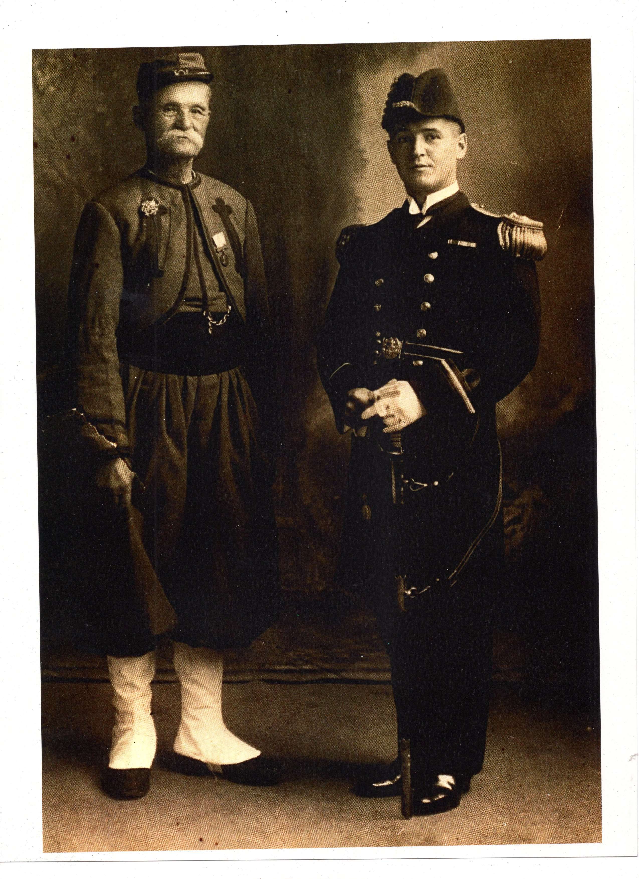Sub-Lieutenant Peter Cossette, RCN in full dress uniform with his grandfather who is wearing the uniform of the Zouave. Courtesy of the Naval Museum of Halifax Peter's grandfather served as a Zouave in the service of the Pope during the struggle for unification of Italy. (source: The Nauticapedia)