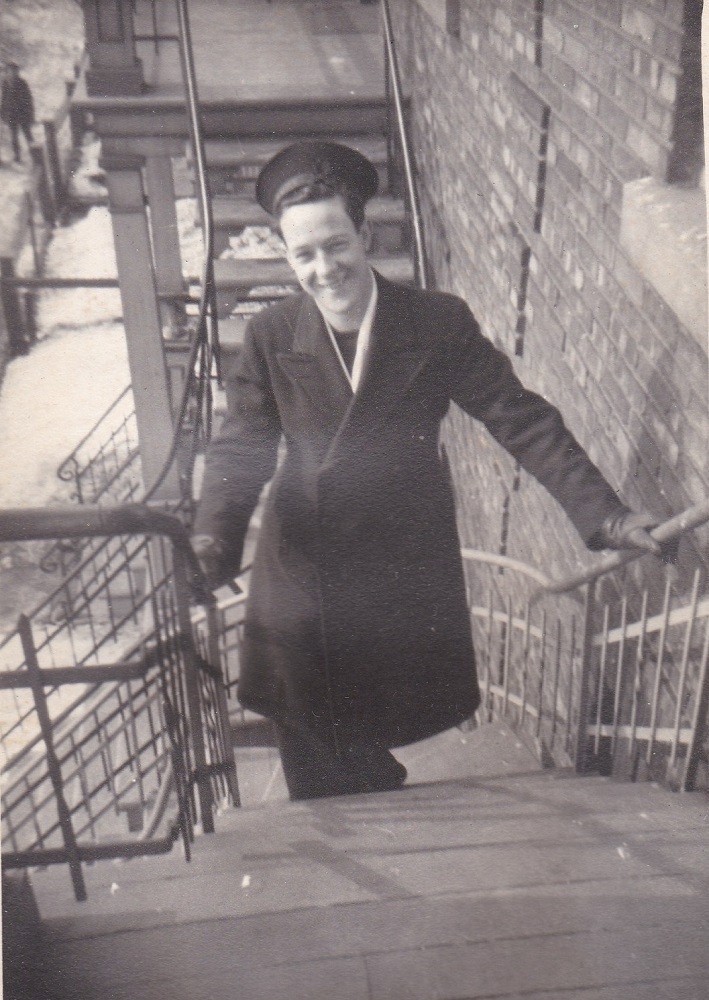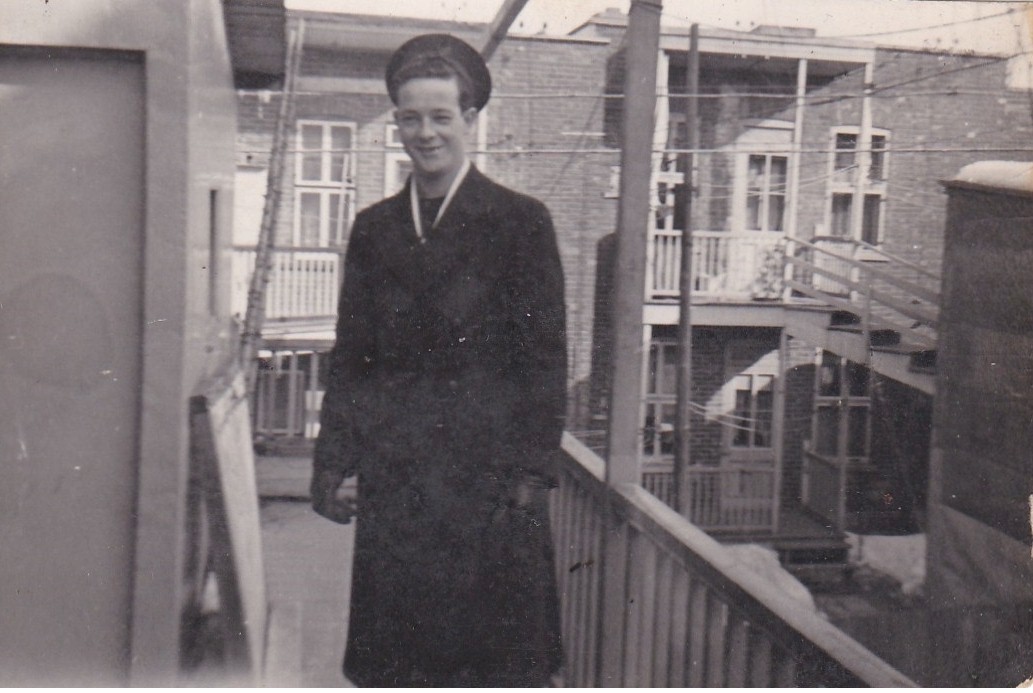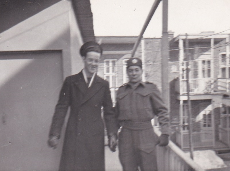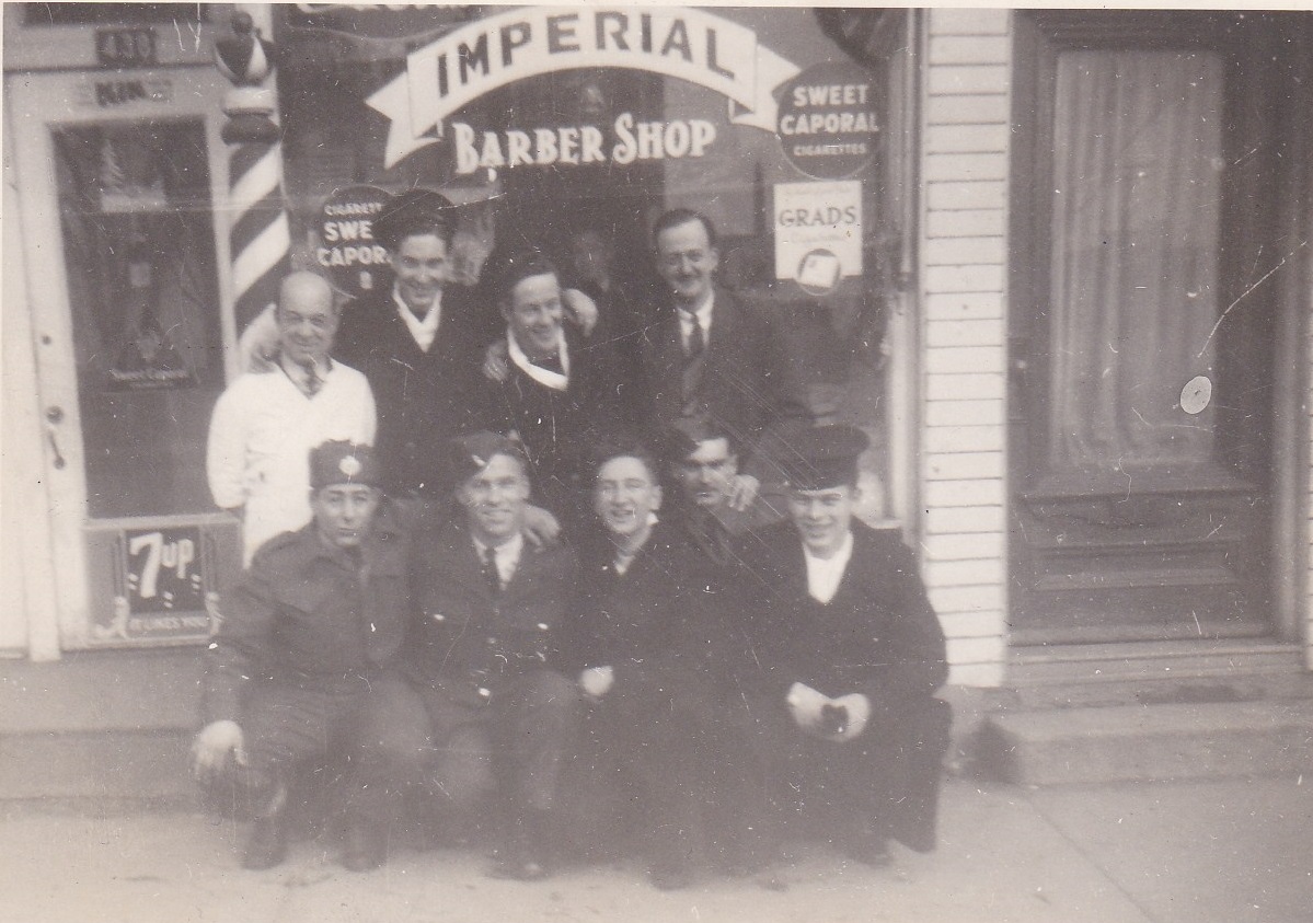 (HH01) Herbert Higgs on Leave, St Denis St, Montreal (HH02) Herbert Higgs on Leave, St Denis St, Montreal (HH03) a bunch of guys outside a barbershop. Front row centre is William (Billy) Grandin, RCNVR, veteran of convoy duty including the Murmansk Run. Herbert joined up with Billy. On the far right is Edouard (Eddy) Daoust, RCNVR. Herbert is in the bask row, 3rd from the left. Photo dated 26 Feb 1944 (HH04) Herbert Higgs (left) and Eddie Daoust (HH05) Herbert Higgs (left) and a friend who is serving in the Army as Herbert's parents place on St. Denis St. Montreal