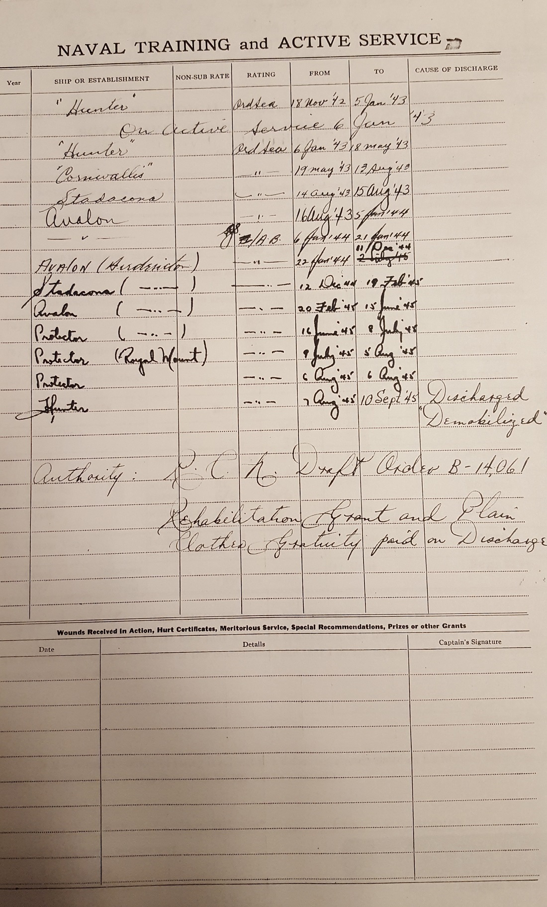 Ships served in: HMCS HUNTER - Enlisted 18 Nov 1942. Commenced Active Service 06 Jan 1943 as an Ordnary Seaman, RCNVR HMCS CORNWALLIS - Drafted to CORNWALLIS 19 May 1943 HMCS STADACONA - Drafted to STADACONA 14 Aug 1943 HMCS AVALON - Drafted to AVALON 16 Aug 1943 * Rated Able Seaman 06 Jan 1944 HMCS FREDERICTON - Drafted to FREDERICTON 22 Jan 1944 HMCS ROYAL MOUNT - Drafted to ROYALMOUNT 09 Jul 1945 HMCS HUNTER - Drafted to HUNTER 07 Aug 1945 * Demobilized 10 Sep 1945