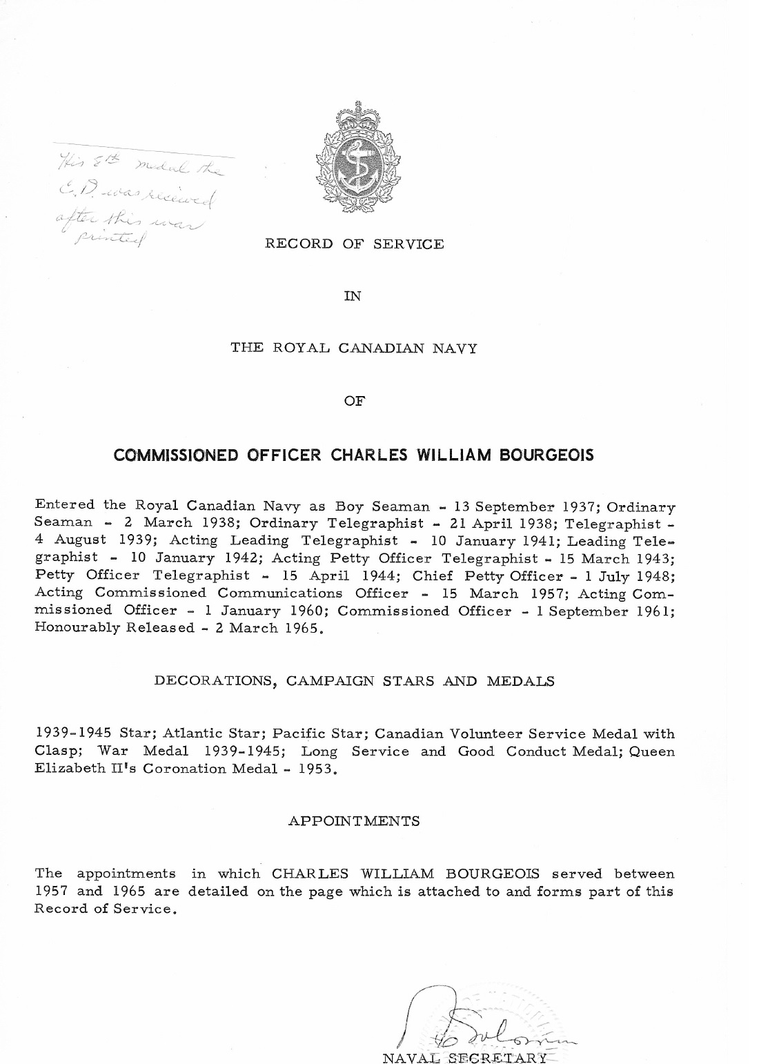 (CB01) Portrait of Commissioned Communications Officer Bourgeois (CB02) Record of Service for Charles William Bourgeois (CB03) List of appointments for Commissioned Officer Bourgeois
