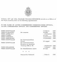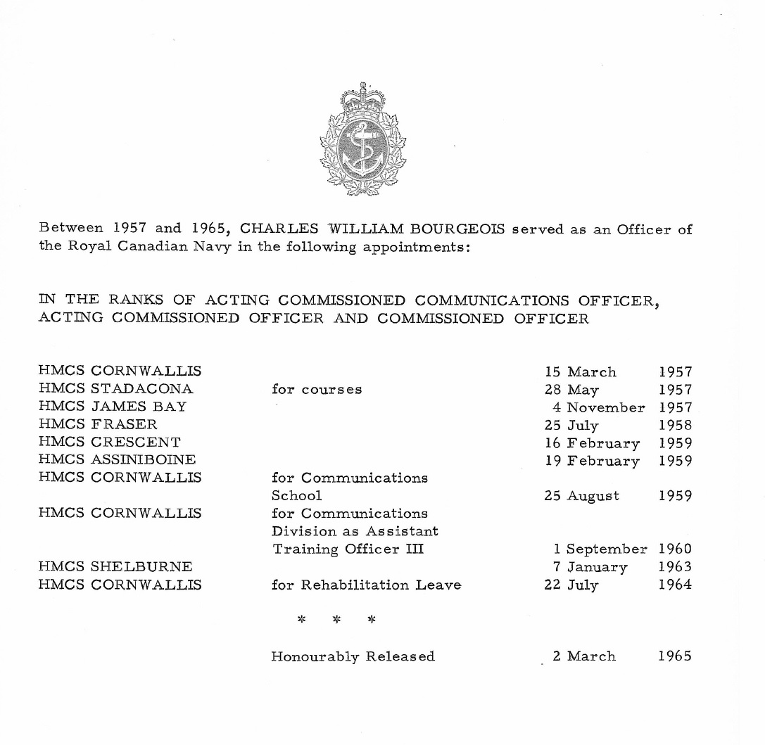 Ships served in: HMS ARETHUSA HMCS CORNWALLIS - Appointed to CORNWALLIS 15 Mar 1957 HMCS STADACONA - Appointed to STADACONA 28 May 1957 HMCS JAMES BAY - Appointed to JAMES BAY 04 Nov 1957 HMCS FRASER - Appointed to FRASER 25 Jul 1958 HMCS CRESCENT - Appointed to CRESCENT 16 Feb 1959 HMCS ASSINIBOINE - Appointed to ASSINIBOINE 19 Feb 1959 HMCS CORNWALLIS - Appointed to CORNWALLIS for Comm School 25 Aug 1959 HMCS CORNWALLIS - Appointed to CORNWALLIS for Comm Div as Assistant Training Officer III 01 Sep 1960 HMCS SHELBURNE - Appointed to SHELBURNE 07 Jan 1963 HMCS CORNWALLIS - Appointed to CORNWALLIS 22 Jul 1964 for Rehabilitation Leave * Honourably Released 02 Mar 1965
