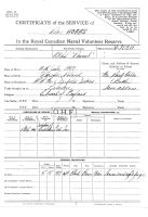 Ships served in: HMCS PREVOST - Enlisted 01 Mar 1944 * Commenced Active Service 20 Mar 1944 as an Ordinary Seaman, RCNVR HMCS CORNWALLIS - Drafted to CORNWALLIS 23 May 1944 HMCS SANS PEUR - Served in SANS PEUR 22-28 Jul 1944 for Seamanship training while at HMCS CORNWALLIS HMCS PEREGRINE - Drafted to PEREGRINE 14 Oct 1944 HMCS SEA CLIFF - Drafted to SEA CLIFF 21 Oct 1944 HMCS STADACONA - Drafted to STADACONA 31 May 1945 HMCS PEREGRINE - Drafted to PEREGRINE 13 Nov 1945 * Transferred to the RCN 19 Nov 1945 as an Able Seaman, RCN HMCS PEREGRINE - Drafted to PEREGRINE 19 Nov 1945 HMCS UGANDA - Drafted to UGANDA 07 Dec 1945 HMCS STADACONA - Drafted to STADACONA 22 Aug 1945 HMCS MICMAC - Drafted to MICMAC 02 Sep 1946 HMCS STADACONA - Drafted to STADACONA 11 Oct 1946 HMCS QUEEN CHARLOTTE - Drafted to QUEEN CHARLOTTE 17 Oct 1946 HMCS STADACONA - Drafted to STADACONA 12 Jul 1947 * Rated Leading Seaman, RCN 01 Jul 1948 HMCS PREVOST - Drafted to PREVOST 02 Sep 1947 HMCS STADACONA - Drafted to STADACONA 10 May 1950 HMCS PREVOST - Drafted to PREVOST 11 Oct 1950 * Honourably discharged 19 Nov 1950 - Engagement expired