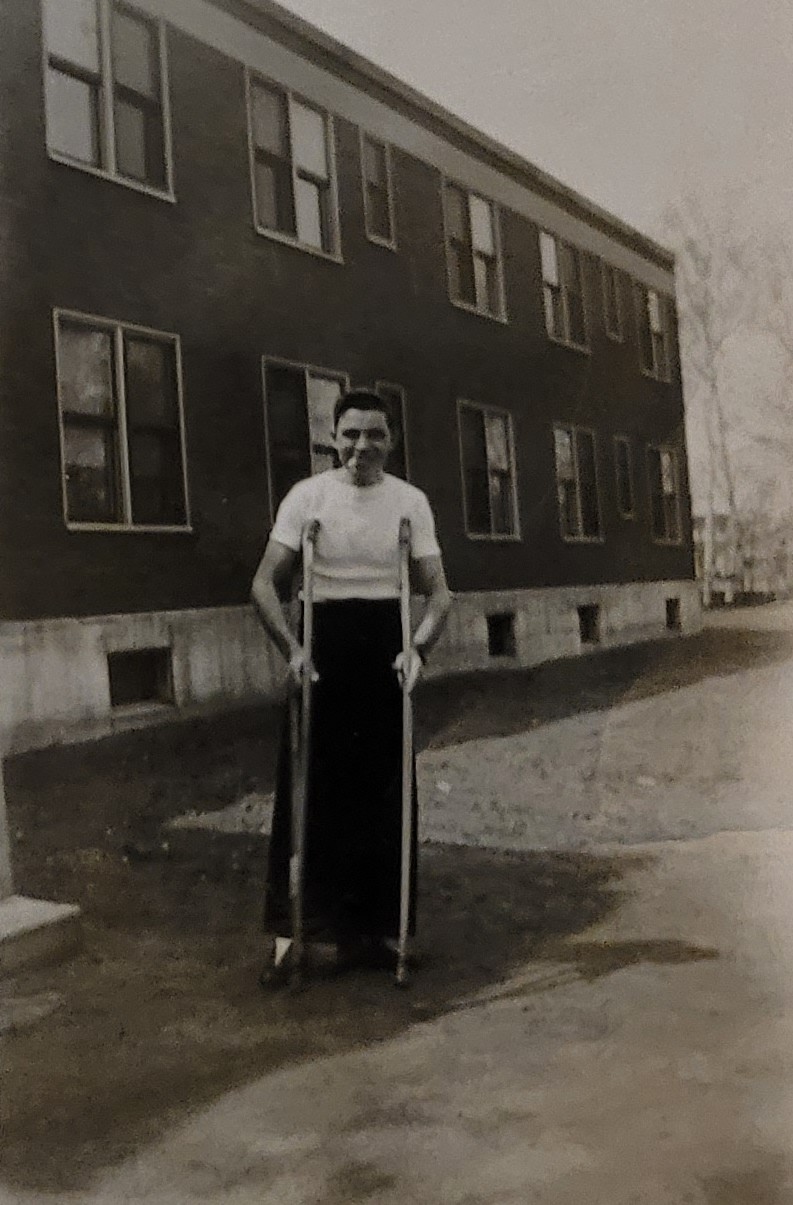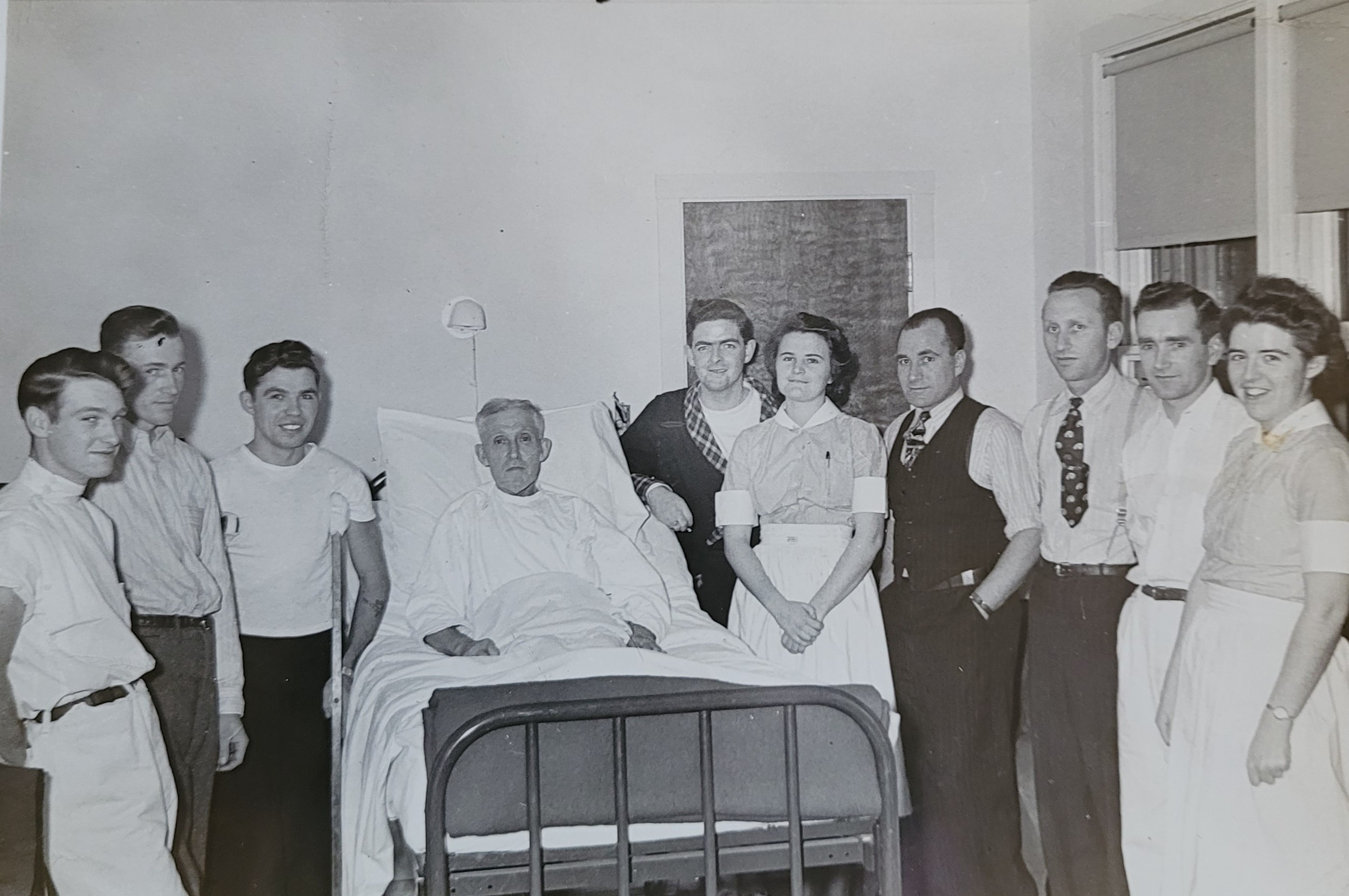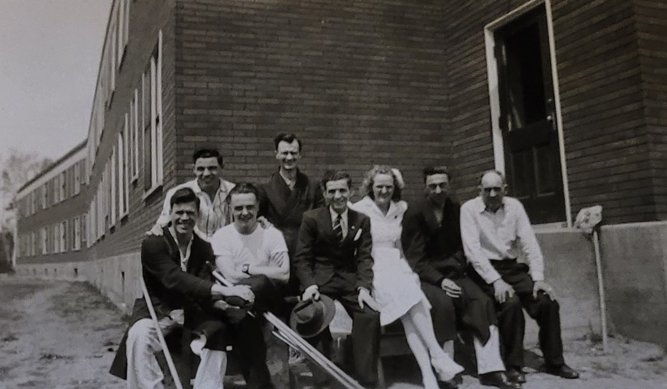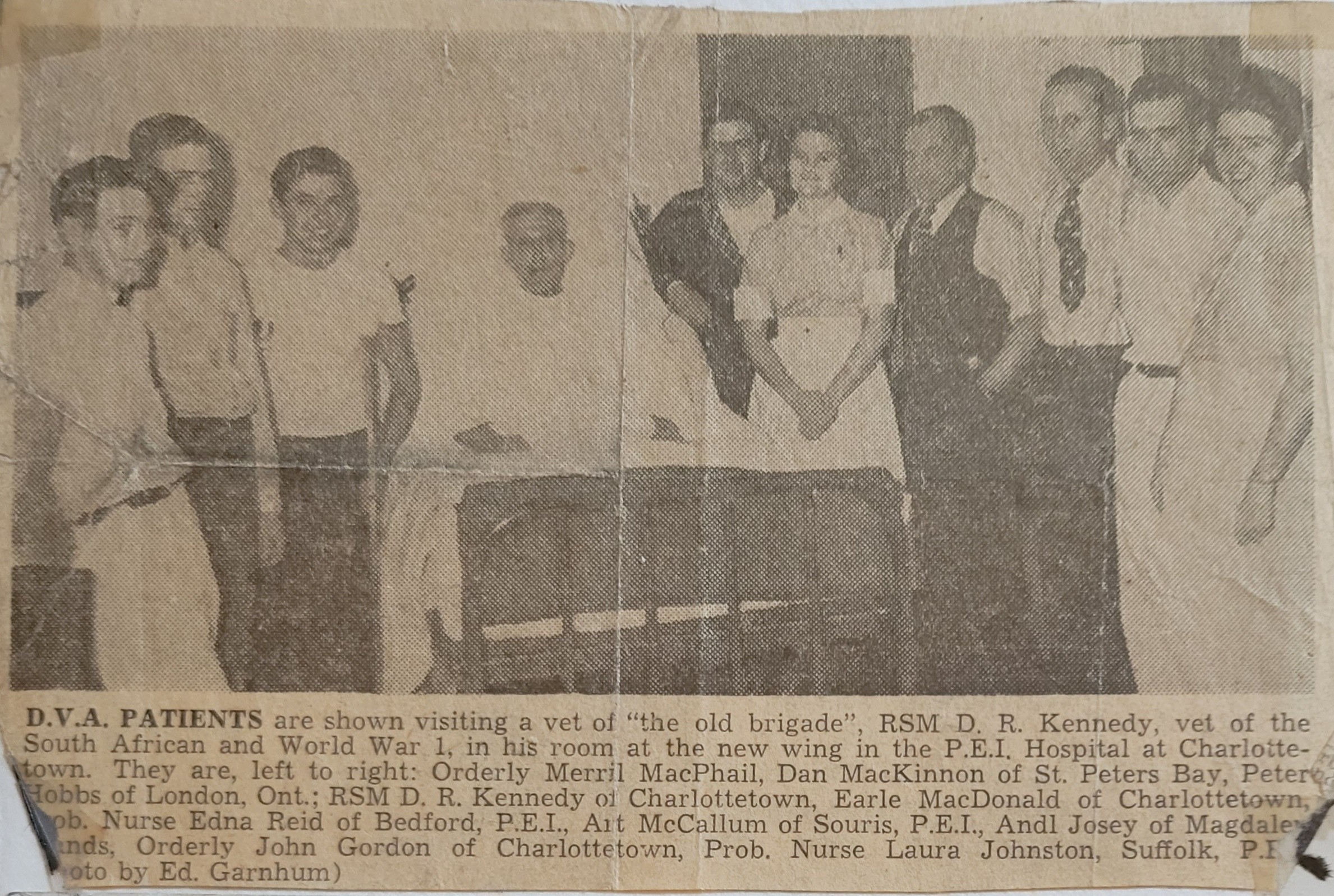 (...) D.V.A. patients are shown visiting a vet of "the old brigade", RSM D.R. Kennedy, vet of the South African and World War 1, in his room at the new wing in the P.E.I. Hospital at Charlottetown. Peter Hobbs 3rd from left (...) Photo used in D.V.A. patients newspaper article (...) Peter Hobbs outside the hospital at Charlottetown, P.E.I. (...) Peter Hobbs, remainder unknown, outside the hospital at Charlottetown, P.E.I.