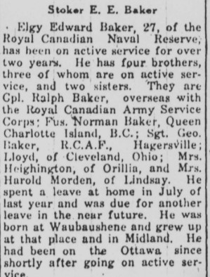 BAKER, Elgy Edward Sto 1c, A2309, RCNR MPK - 13 Sep 1942, HMCS OTTAWA - Son of Mr. and Mrs. John Thomas Baker, of Orillia, Ontario.