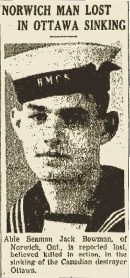 BOWMAN, Eric Jack, AB, V17584, RCNVR, MPK - 13 Sep 1942, HMCS OTTAWA - Son of George William and Mable Bowman, of Norwich, Ontario.