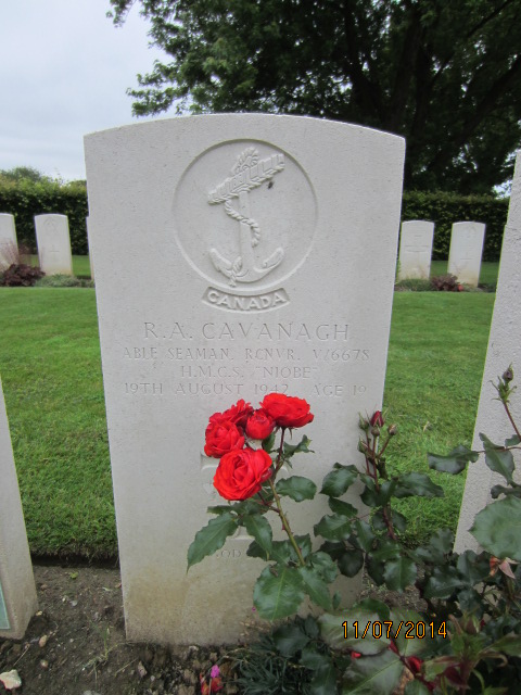 Able Seaman R. A. Cavanagh was one of seventy-one men of Combined Operations; R.C.N.V.R. took part in the Dieppe raid, August 19, 1942. One officer and 3 sailors died at 03:47 hours (that day) in the Channel, they were killed in a fiery exchange with a small German convoy. He was buried in the Dieppe Canadian War Cemetery, Hautot-sur-Mar, Seine-Maritime, France.